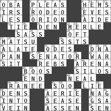 ACROSS 1. Chief or king in Benin or Nigeria 4. Entreaties 9. Folds over and sews together 13. Big collection agency 14. Cowboy competition 15. Nights before holidays 16. French article 17. Greek mythologigal hunter 18. Assistant 19. Neckwear 21. Lair 22. Haggard of country music 24. Backtalk 26. Often (poetically) 27. Taiwanese island in East China Sea 29. Fast planes 30. Having winglike extensions 31. Lyric poems 33. Heredity factor (abbr.) 36. Baking dish 37. Legislator 40. Armed conflict 41. Be seated 42. Confederate soldiers (slang) 43. Sports stadium 45. Scornful sounds 47. Grain storage towers 48. Conclude 49. Actress Patricia 50. The wife of a rajah (variant) 52. "Barney Miller" actor Jack 54. Untruth 56. Hiding places for outlaws 57. Nest on high 59. Tired old horse 61. To the inside or interior of 62. Gospel singer Marvin 63. Girls' org. (abbr.) 64. Distinctive style or manner 65. NE Netherlands city 66. Elected rep. DOWN 1. Petroleum 2. Cy Young winner Saberhagen 3. Aide 4. Adept person 5. Titled peers of a realm 6. Singer Brickell 7. Age 8. Boy, to dad 9. Centers of feelings and intuitions 10. Morally bad or wrong 11. Ancient Persian 12. Compass dir. 20. Compass direction 22. With motion or animation 23. Bank Draft (abbr.) 25. Institutes legal proceedings 27. Atlas contents 28. Mountain range southwest of Kyrgyzstan 29. Arranges properly for use 31. Singles 32. Small moist lump or mass 33. Homes 34. Billionth: prefix 35. Caspian sea tributary 38. Wear away 39. To erase 44. Monetary unit of Yemen 45. Gillaume's butler role 46. Single 49. Annoying sound 50. French philosopher Descartes 51. Against 52. Observes 53. Mouths or openings 55. Relaxation 56. HTML Container Element 57. White ___ sheet 58. Car or cant ending 60. Separate the seeds from cotton