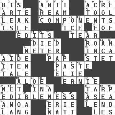 ACROSS 1. Altar cloth linen 4. Against 8. Measure of real estate 12. Johnson of "Laugh-In" 14. 480, 500 or 516 sheets of paper 15. Utensil 16. Path through which fluid escapes 17. Parts 20. Capri or Wight 21. Frozen water 22. Enemy 23. Prepares for publication 27. Lacerate 29. Passed on 31. Wander 34. Distance measurement 35. South American Indian 36. Helper 39. Infant food 41. Proofreading order 42. Detail 43. Thick mixture 46. Falsehood 47. Writer Wiesel 48. _ vera 51. Bert's buddy 54. Fish or hair follower 56. _ tizzy (2 wds.) 58. Canvas cover 61. The property of being fit to eat 66. At sea 67. Small Philippine buffalo 68. One of the Great Lakes 69. Grant temporary use of 70. Austrian-born American filmmaker Fritz 71. Electrical Unit 72. French article DOWN 1. Indonesian resort city 2. Angers 3. Showing deterioration from age 4. Curve 5. Modern: prefix 6. Scottish cap 7. Body of Kaffir warriors 8. Had dinner 9. Meet 10. Printing process, for short 11. Otherwise 13. Made supply last 18. Sep. follower 19. Born 24. Binary compound 25. Teat (slang) 26. Ooze 28. Originate 30. Window treatment 32. Adept person 33. Floor covering 34. Klaipeda city 36. Small island 37. Call ___ day 38. Accusation by an informer 40. Light colored 44. Title for a knight 45. "___ Little Indians" 49. Petroleum 50. Compass dir. 52. Slanted text style (abbr.) 53. Artist's stand 54. Be tempered by heat 55. Pulitzer Prize-winning author Ferber 57. Afresh 59. French philosopher Descartes 60. Writing tablets 62. Paper or plastic container 63. Period 64. Be seated 65. Arrange properly for use