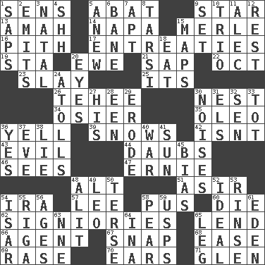 ACROSS 1. Elected reps. 5. Blind as ____ 9. Play the lead 13. Wet nurse 14. California wine valley 15. Haggard of country music 16. Essential or central part 17. Pleas 19. R.R. building 20. She-sheep 21. Plant excrement 22. Sep. follower 23. Kill 25. It is 26. Giggle 30. A home for chicks 34. Flexible twig of a willow tree 35. Butter sub 36. Shout 39. Overwhelms 42. Is not 43. Tending to cause great harm 44. Applies to a surface 46. Observes 47. Bert's buddy 48. Keyboard modifier key 51. SW Saudi Arabia district 54. Lyricist Gershwin 57. Area sheltered from the wind 58. Suppuration 60. Expire 62. Seigniories (variant) 65. Grant temporary use of 66. Rep 67. Fastener 68. Comfort 69. To erase 70. Hearing organs 71. Small, secluded valley DOWN 1. Plant excrements 2. Sends forth 3. Relating to or accompanying birth 4. Quiet! 5. Afresh 6. Object of repulsion 7. Fitting 8. Tarsus (plural) 9. Put into a specified state 10. Musical group of three 11. Actor Baldwin 12. Repose 15. Atlas contents 18. Erode 20. Sight organs 24. Ringlike coral islands and reefs 27. Part of HMS, perhaps 28. Car or cant ending 29. Wear away 30. Annoying sounds 31. Raised railways 32. Elected rep. 33. Small child 36. Affirmative reply 37. Night before a holiday 38. Untruth 40. Armed conflict 41. Player for Phoenix 45. Prejudice 48. Set down 49. Lion 50. Laconic 52. Standard of perfection 53. Wash lightly 54. Austrian river, tributary to the Danube 55. Port city in Latvia 56. Ripens 58. Lightbulb-shaped fruit 59. United States Postal Service (abbr.) 61. Paradise 63. Compass dir. 64. _ tizzy (2 wds.) 65. Part of a journey
