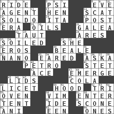 ACROSS 1. Travel on or in a vehicle 5. Air pressure measure (abbr.) 8. Night before a holiday 11. Representative 13. Layer 14. Leave at once 15. Twentieth part of a lira 16. Call ___ day 17. Mail 18. Period 19. Petroleums 21. An organ shaped like a helmet 22. Tense 24. Ancient Greek god of war 25. Dirtied 27. A female animal or person 29. Greek god of love 30. Memphis, Tenn. Street 32. Billionth: prefix 33. Having ears or earlike features 35. "____ silly question..." 39. Stone: prefix 41. Proofreading order 42. Adept person 43. Develop 45. Flaplike coverings 48. Root beer relative 49. It is permitted: Lat. 50. Parka part 52. Three (prefix) 55. Baking chamber 56. Zeal 57. Keyboard key 59. Portable shelter 60. Binary compound 61. Biscuitlike quick bread 62. Black tropical American cuckoo 63. Car or cant ending 64. Singles DOWN 1. To erase 2. Russian composer Stravinsky 3. Accusation by an informer 4. Conclusion 5. Silvers or Donahue 6. Arranges properly for use 7. _ tizzy (2 wds.) 8. Learning spot: Fr. 9. Flower holders 10. Singer James 12. Woman's close-fitting hat 14. Coast Guard woman 20. It would 21. Highlander 23. Columnist Joseph or Stewart 25. Elected rep. 26. Mouth or opening 27. Observe 28. Possessed 30. Sis' sibling 31. Artist's stand 33. And so on (abbr.) 34. "We ___ not amused" (Victoria) 36. Ski resort town in Vermont 37. Barrel 38. Had dinner 40. 90 degrees 43. Environmental prefix 44. Methods 45. Make or become more lively 46. Ancient Celtic tribe of eastern Britain 47. Scratch 49. Globular water bottle used in Asia 50. Flintstone garb 51. Sign of things to come 53. French philosopher Descartes 54. Angers 56. Compete 58. Non-commissioned officer (abbr.)