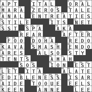 ACROSS 1. Fitting 4. Slanted text style (abbr.) 8. Of the mouth 12. Hindu Mythology: god of death 14. Nothings 16. Lie 17. Of or related to the anus 18. Pleas 20. Vertical member of a panel or frame 22. It is 23. Fish or hair follower 24. Fast jet (abbr.) 25. Health resort 28. Alias (abbr.) 30. Stern 31. Following 35. Egg _ yung 37. Capital of the state of Qatar 40. Make new 41. Polynesian shrub of the pepper family 42. Box-office sellout 44. Inside; within (prefix) 45. Ancient Greek god of war 46. In addition 47. Filthy place 48. Portable shelters 50. Housemaid 52. Distress signal 54. Electrically charged atom 55. Eastern Standard Time (abbr.) 58. Allow 61. Call ___ day 63. Having winglike extensions 65. The property of being fit to eat 70. Austrian river, tributary to the Danube 71. Assistant 72. Woman's close-fitting hat 73. Snakelike fish 74. Peachy ____! 75. Singer Murray 76. Area sheltered from the wind DOWN 1. Collect or gather 2. Leg coverings 3. Distinguishing feature 4. Ending with capital 5. "___ Little Indians" 6. Tate display 7. Australian parrot (variant) 8. Baseball player Mel 9. Water falling in drops from the sky 10. Toward shelter 11. For fear that 13. Everything 15. Stalk of a moss capsule 19. "____ silly question..." 21. Compass dir. 26. Groovy apts. 27. Odor 29. Anew 30. Exposes to great heat 32. Portable shelter 33. Whirlpool 34. Friend of Pooh 35. Conductor's collection 36. Baking chamber 38. Actor Linden 39. Slender Brazilian palm 41. Krazy ___ of comics 43. Like (prefix) 49. The visible part of the earth's surface 51. Santa ___, CA 53. Proofreading order 55. Artist's stand 56. Showing deterioration from age 57. Laconic 58. Path through which fluid escapes 59. Singer Brickell 60. Event that recurs at intervals 62. Small Philippine buffalo 64. Untruth 66. Benjamin's nick name 67. Period of immesurable duration 68. Player for Phoenix 69. Perceive with the eye
