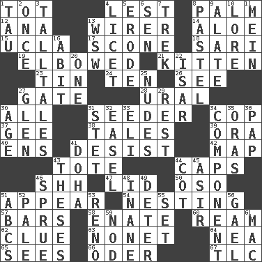 ACROSS 1. Small child 4. For fear that 8. Inside of hand 12. Santa ___, CA 13. One who wires 14. _ vera 15. Southern CA. univ. 17. Biscuitlike quick bread 18. Indian skirt 19. Shoved, as through a crowd 21. Baby cat 23. Shallow baking pan 24. Nine, plus one 26. Observe 27. Yard entry 28. Mountain range 30. 100% 31. Sowing specialist 34. Police officer (slang) 37. Turn to the right 38. Stories 39. Mouth or opening 40. Followers of ems 41. Stop 42. Atlas unit 43. Carry 44. Smile enhancers 46. Quiet! 47. Hat (slang) 50. Bear (Spanish) 51. Seem 54. Inhabiting a nest 57. Oblong pieces of solid material 58. Maternal 60. 480, 500 or 516 sheets of paper 62. A slight indication 63. Music written for nine 64. Teachers' org. 65. Observes 66. River in Europe 67. Affectionate concern, for short DOWN 1. The 19th letter of the Greek alphabet 2. At one time in the past 3. Baron Munchausen's specialties 4. It is permitted: Lat. 5. Wear away 6. Elected rep. 7. Long journey 8. Soft color 9. Having winglike extensions 10. Old wives' tales, e.g. 11. Chow _ 13. Compass dir. 16. "This won't hurt ____!" 20. Single 22. Austrian river, tributary to the Danube 25. Unadorned figures 27. Small, secluded valley 29. Repose 30. Grow older 31. Proofreading order 32. Artist's stand 33. Connecticut Ivy Leaguer 34. Part 35. Mouths or openings 36. Infant food 41. Capital of the state of Qatar 43. College papers 44. Small bed 45. SW Saudi Arabia district 46. Disorder 48. Empty; void 49. Prevent from occurring 51. Lettered men learn these first 52. Diluted with white 53. Former U.S. Attorney General Janet 55. Arrange properly for use 56. Highlander 59. Allow head to fall sleepily 61. Big _