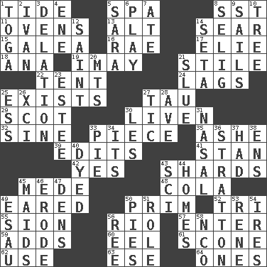 ACROSS 1. Periodic rise and fall of the sea level 5. Health resort 8. Fast jet (abbr.) 11. Baking chambers 13. The first octave above the treble staff 14. Singe 15. An organ shaped like a helmet 16. Actress Charlotte 17. Writer Wiesel 18. Santa ___, CA 19. "If ____ say so..." 21. Vertical member of a panel or frame 22. Portable shelter 24. Falls behind 25. Is extant 27. The 19th letter of the Greek alphabet 29. Highlander 30. Make or become more lively 32. Trig term 33. Part 35. American tennis player Robert 39. Proofreads 41. Comedian Laurel of Laurel & Hardy 42. Affirmative reply 43. Broken pieces 45. Ancient Persian 48. Root beer relative 49. Having ears or earlike features 50. Demure 52. Three (prefix) 55. The Jewish people; Israel 56. River (Sp.) 57. Keyboard key 59. Does sums 60. Snakelike fish 61. Biscuitlike quick bread 62. Purpose 63. Compass dir. 64. Singles DOWN 1. Ancient Roman robe 2. _ the terrible 3. Conveyance 4. Compass dir. 5. "Two Mules for Sister ____" 6. Shaw product 7. Had dinner 8. Former Milwaukee Brewers owner Bud 9. Moves on water 10. Woody plant 12. Virtuous person 14. Bristle 20. Mountains (abbr.) 21. Change direction abruptly 23. First name in cosmetics 25. Double-curved letter 26. One more than ninety 27. Nervous spasm 28. "___ Maria" 30. French article 31. Rhinal 33. Sliced dessert 34. It is 36. Ski resort town in Vermont 37. Possessed 38. Followers of ems 40. Colored 43. _-fi 44. Residences 45. Women servants 46. Eat (away) 47. Hiding places for outlaws 49. Son of Isaac 50. Sliced desserts 51. Hero or heavy, e.g. 53. French philosopher Descartes 54. Angers 56. To riddle 58. Non-commissioned officer (abbr.)