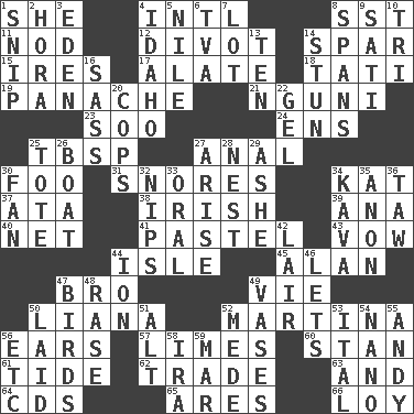 ACROSS 1. A female animal or person 4. International (abbr.) 8. Fast jet (abbr.) 11. Dreamland 12. A piece of turf (Scot.) 14. Coast Guard woman 15. Angers 17. Having winglike extensions 18. Jacques of French films 19. Flamboyance 21. Group of southern Bantu languages 23. "Barney Miller" actor Jack 24. Followers of ems 25. Cook's measure (abbr.) 27. Of or related to the anus 30. Egg _ yung 31. Sounds asleep 34. Krazy ___ of comics 37. _ moment's notice (2 wds.) 38. From or relating to Ireland 39. Santa ___, CA 40. Fish or hair follower 41. Soft color 43. Promise 44. Capri or Wight 45. Actor Alda or Thicke 47. Sis' sibling 49. Compete 50. Climbing, woody, usually tropical vines 52. Chrissie's court nemesis 56. Hearing organs 57. Citrus fruits 60. Comedian Laurel of Laurel & Hardy 61. Periodic rise and fall of the sea level 62. Exchange 63. Added to 64. Music discs 65. Ancient Greek god of war 66. Myrna of the movies DOWN 1. Sever or remove by pinching or nipping 2. Israeli folk dance 3. Locale of original sin 4. Potato state 5. "Death on the ____" 6. Federal power corp. 7. Car dealer's back yard 8. Connects, as a bridge 9. Suttee (variant) 10. Three (prefix) 13. Nine, plus one 14. Astound 16. Backtalk 20. 911 reaches them 22. Set 25. Carry 26. Water vessel 27. Get up 28. A home for chicks 29. American tennis player Robert 30. Avid follower 32. Pinches, bites 33. Relating to the mouth 34. Polynesian shrub of the pepper family 35. At once, immediately (arch.) 36. The 23rd letter of the Hebrew alphabet 42. Den 44. Electrically charged atom 46. Allows 47. Avian creatures 48. Raze (variant) 49. Flower holders 50. Put down 51. Keyboard modifier key 52. Ancient Persian 53. Slanted text style (abbr.) 54. Billionth: prefix 55. Actor Griffith 56. And so on (abbr.) 58. Retirement account (abbr.) 59. Third mo.