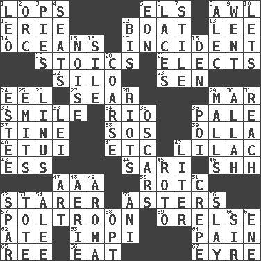 ACROSS 1. Chops off 5. Raised railways 8. Leather borer 11. One of the Great Lakes 12. Water vessel 13. Area sheltered from the wind 14. Seas 17. Event 19. Unemotional ones 21. Chooses 22. Grain storage tower 23. Elected rep. 24. Snakelike fish 27. Shrivel 29. Third mo. 32. Grin 34. _ de Janeiro 36. Diluted with white 37. Prong on a fork 38. Distress signal 39. Water jar 40. Needle holder 41. And so on (abbr.) 42. Pale purple color 43. Double-curved letter 44. Indian skirt 46. Quiet! 47. American Automobile Association (abbr.) 50. College mil. group 52. A viewer who gazes fixedly 55. Michaelmas daisies 57. Characterized by complete cowardliness 59. Threatening words 62. Had dinner 63. Body of Kaffir warriors 64. Ache 65. To separate or throw off 66. Ingest 67. Jane of fiction DOWN 1. Lion 2. The grampus (Milton) 3. Sliced desserts 4. Theater features 5. Age 6. Shoestrings 7. Vertical member of a panel or frame 8. Actor Baldwin 9. Gone 10. Allows 12. Twice 15. Annoying sound 16. Filth; sediment 18. Lair 20. Unrefined 24. First name in cosmetics 25. Sends forth 26. "_ and Lucy" (Charlie Brown theme song) 28. Disturbances 29. Promenades 30. Assad's deity 31. Arrive at 33. Luau accessory 35. Motion picture awards 36. Luau course 42. 61 cubic inches 45. Printing process, for short 47. Tate display 48. Nest on high 49. Odor 51. Streamer paper 52. Practice fight 53. Lug 54. Toward shelter 55. Cuckoo 56. Kill 58. Choose 60. Title for a knight 61. Compass dir.