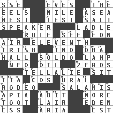 ACROSS 1. Compass dir. 4. Nights before holidays 8. Definite Article 11. Snakelike fish 13. "Death on the ____" 14. At sea 15. A home for chicks 16. Trial 17. Table seasoning 18. Orator 21. Dipping utensil 22. General guideline 23. Observe 25. Period of immesurable duration 26. Atmosphere 29. Veterans Day date 32. From or relating to Ireland 34. Indiana (abbr.) 35. Chief or king in Benin or Nigeria 38. Shopping center 39. Twentieth part of a lira 41. Desk light 43. Modern: prefix 44. Petroleum 45. Nothings 46. Copy Pinocchio 50. Be seated 51. Call ___ day 54. Music discs 55. Mountain range 57. Cowboy competition 59. Deli grouping 63. Capital of Western Samoa 64. "This won't hurt ____!" 67. Greater amount 68. A blast of a horn 69. Den 70. Paradise 71. Double-curved letter 72. Operatic vocal solo 73. Eastern Standard Time (abbr.) DOWN 1. Elected reps. 2. Ooze 3. Otherwise 4. Main course 5. Compete 6. Raised railways 7. Arrange properly for use 8. Sadhe (variant) 9. Phone greeting 10. Ingested 12. Play the lead 14. White ___ sheet 19. Malaysian steamed pastry 20. Pipe bend 21. Allow 23. Post 24. Inside; within (prefix) 26. Direct toward a target or goal 27. SW Asia republic 28. Cause heat under the collar 30. Country residence 31. Hollow 33. Notch 36. Drinking establishments 37. Mine, in Marseilles 39. Disposed of to a purchaser 40. Petroleums 42. Pacific Standard Time (abbr.) 45. Ardor 47. Environmental prefix 48. A period of five years 49. Retirement account (abbr.) 51. Feeling or showing extreme anger 52. Literary convention 53. Goodbye (Sp.) 56. Unable to walk 58. Ingest 60. Method 61. Angers 62. Transmitted 64. Wing 65. Tavern 66. One more than two
