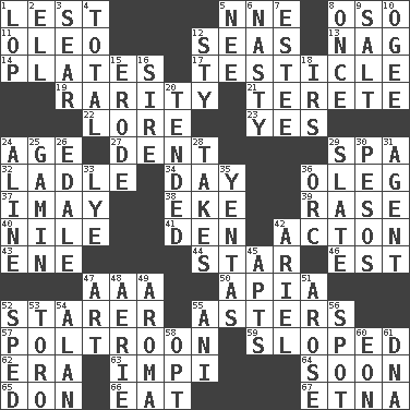 ACROSS 1. For fear that 5. Compass dir. 8. Bear (Spanish) 11. Butter sub 12. Oceans 13. Tired old horse 14. Food holders 17. One of the two male reproductive glands 19. Noteworthy scarcity 21. Cigar-shaped 22. Old wives' tales, e.g. 23. It is so 24. Mature 27. Scratch 29. Health resort 32. Dipping utensil 34. 24 hours 36. Cassini of fashion 37. "If ____ say so..." 38. Make supply last 39. Raze (variant) 40. Mediterranean tributary 41. Lair 42. Gambison 43. Compass dir. 44. Play the lead 46. Eastern Standard Time (abbr.) 47. Auto club (abbr.) 50. Capital of Western Samoa 52. A viewer who gazes fixedly 55. Michaelmas daisies 57. Coward 59. Had an oblique or slanted direction 62. Epoch 63. Body of Kaffir warriors 64. Within a short period 65. Spanish title 66. Erode 67. Inactive volcano in Sicily DOWN 1. Chop off 2. Pipe bend 3. Shrivel 4. "_____ Recall" 5. Born 6. Difficult 7. First name in cosmetics 8. Single time 9. Table seasoning 10. Double curve, resembling the letter S 12. Filthy place 15. Wear away 16. Title for a man of rank and authority 18. Big collection agency 20. Watched over 24. Place in a line 25. Street urchin 26. Peak District village in England 28. Receives possession of 29. Chalkboard 30. Mexican monetary units 31. Representative 33. Potassium hydroxide 35. Gossips 36. The grampus (Milton) 42. Satellite of Uranus 45. Tenement units (abbr.) 47. Tate display 48. Nest on high 49. Scent 51. Came up 52. Broke a traffic law 53. "Corrida" creature 54. ____ Jay Lerner 55. Black tropical American cuckoo 56. Specific locale 58. Choose 60. Age 61. Heredity factor (abbr.)