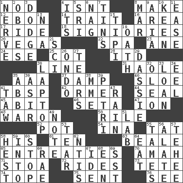 ACROSS 1. Lower and raise head in agreement 4. Is not 8. Create 12. Inky black, to poets 14. Distinguishing feature 16. Length times width 17. Travel on or in a vehicle 18. Seigniories (variant) 20. Viva Las _ 22. Health resort 23. One (Scot) 24. Compass dir. 25. Small bed 28. It would 30. Actor's bit 31. White Person, in Hawaii 35. Auto club (abbr.) 37. Moist 40. _ gin 41. Cook's measure (abbr.) 42. Abalone 44. Lick closed 45. "This won't hurt ____!" 46. Stalk of a moss capsule 47. Electrically charged atom 48. Make _____ (do battle with) 50. Cause heat under the collar 52. Plant holder 54. _ tizzy (2 wds.) 55. Make lace 58. Part of HMS, perhaps 61. "___ Little Indians" 63. Calif. Air Force Base 65. Pleas 70. Housemaid 71. Portico 72. Amusement-park features 73. Wig 74. Drink excessively 75. Emitted 76. Observe DOWN 1. Impudent aggressiveness 2. Off-Broadway awards 3. Evade 4. ___ a Wonderful Life 5. _ Lanka 6. Tired old horse 7. Metal containers 8. Spoil 9. Roberta Peters solo 10. Peachy ____! 11. Relaxation 13. Teachers' org. 15. Native american tent (variation) 19. Pledge 21. _-fi 26. Southwest Nigerian state 27. Lacerates 29. Hyrax 30. Portable computer 32. Butter sub 33. Grant temporary use of 34. Snakelike fish 35. Swedish rock group 36. SW Saudi Arabia district 38. Madame (abbr.) 39. _ dish (used to culture cells) 41. The 23rd letter of the Hebrew alphabet 43. Water falling in drops from the sky 49. Observe 51. Experiment locale 53. Lacerate 55. Makes less strong or intense 56. Having winglike extensions 57. Giggle 58. Command 59. To the inside or interior of 60. Close up, plug up 62. Nuclear Threat Initiatives 64. Consume 66. Actress Charlotte 67. Binary compound 68. Car or cant ending 69. Fast jet (abbr.)