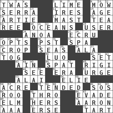 ACROSS 1. It was, poetically 5. Welles in "The Third Man" 9. Cut the grass 12. Spanish missionary in California 14. Angers 15. Grow older 16. Nick name for Arthur 17. Vertical spar for supporting sails 18. Beverage made from leaves 19. To sift 20. Seas 23. One who uses or employs something 24. Small Philippine buffalo 25. Shade of tan 27. Chooses 30. Pacific Standard Time (abbr.) 32. Health resort 33. Riding implement 34. Oceans 36. According to 38. Coat; cloak 39. Nilotic language 40. Put into a specified state 43. The 18th letter of the Arabic alphabet 46. Argument over a trivial matter 48. Swiss mountan, "Queen of the Mountains" 49. Perceive with the eye 51. Epoch 52. Goad 53. Jai ____ 54. Writer Wiesel 56. Measure of real estate 58. Looked after 61. Distress signal 64. Friend of Pooh 65. Through, poetically 66. Dodge 68. Shade tree 69. Possessive pronoun 70. Composer Copland 71. American Automobile Association (abbr.) 72. Celtic language 73. Small pie DOWN 1. Russian ruler of old 2. We are 3. Johnson of "Laugh-In" 4. Indian title of respect (Mr.) 5. Pale green bean 6. SW Asia republic 7. Makes clutter 8. Eastern Standard Time (abbr.) 9. Taiwanese island in East China Sea 10. Double curve, resembling the letter S 11. Erode 13. A really long time 21. 911 reaches them 22. Artist's stands 23. Mountain range 24. Cleo's killer 26. Tax preparer (abbr.) 27. Sep. follower 28. Adept person 29. Ancient Roman robe 31. Grayish beige 35. Flew 37. SW Saudi Arabia district 41. Oval reproductive body of a fowl 42. Neckwear 44. Capri or Wight 45. Teachers' org. 47. Falsehood 48. Sorrow 50. One or the other of two 53. Scent 55. The content of cognition 56. Type of rug 57. Root beer relative 59. Blunders 60. Characteristic smell of wine 61. "Two Mules for Sister ____" 62. Scent 63. Posted 65. Definite Article 67. Large container