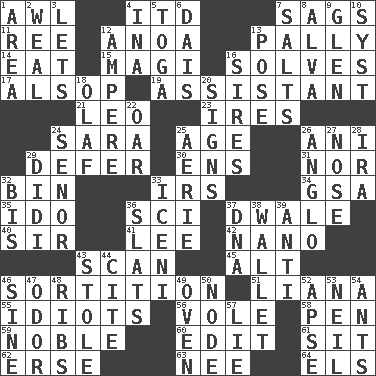 ACROSS 1. Leather borer 4. It would 7. Droops 11. To sift 12. Small Philippine buffalo 13. Friendly 14. Erode 15. Wise men 16. Finds the solution 17. Columnist Joseph or Stewart 19. Aide 21. Lion 23. Angers 24. "Two Mules for Sister ____" 25. Grow older 26. Black tropical American cuckoo 29. Postpone 30. Followers of ems 31. Not either 32. Storage container 33. Big collection agency 34. Girls' org. (abbr.) 35. Wedding promise 36. _-fi 37. A sleeping potion; an opiate (poet.) 40. Title for a knight 41. Area sheltered from the wind 42. Billionth: prefix 43. Glance over 45. The first octave above the treble staff 46. Determination 51. Woody, climbing, usually tropical plant 55. Foolish or stupid persons 56. Grand slam 58. Writing instrument 59. Impressive in appearance 60. Prepare for publication 61. Be seated 62. Celtic language 63. Born 64. Raised railways DOWN 1. Length times width 2. Welt 3. Allows 4. _ tizzy (2 wds.) 5. Ancient Roman robe 6. Raised platform 7. Table seasonings 8. Inventor's middle name 9. Small, secluded valley 10. System (abbr.) 12. Electrical Unit 13. Airs 16. Male parents of animals 18. Norwegian king 20. Attaches a signature 22. Boat paddle 24. Sir (Sp.) 25. Nest on high 26. White American of non-Hispanic descent 27. Olfactory organ 28. Retirement account (abbr.) 29. "You Light Up My Life" star Conn 32. Twice 33. Ancient Celtic tribe of eastern Britain 36. Narrow boards 37. Heredity factor (abbr.) 38. Place for singles 39. Against 43. Fur scarf 44. Quote 46. Trig term 47. Scent 48. Chest bones 49. Baking chamber 50. Thickened enlargement 52. Domed church section 53. Famous astronaut Armstrong 54. Pismires 57. Untruth