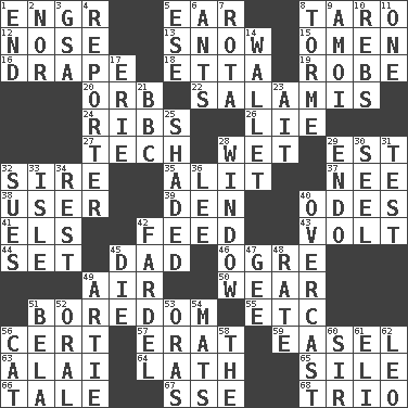 ACROSS 1. Engineer (abbr.) 5. Ewer handle 8. Edible starchy tuberous root 12. Olfactory organ 13. Overwhelm 15. Sign of something about to happen 16. Window treatment 18. Singer James 19. Loose flowing garment 20. Globe 22. Deli grouping 24. Teases 26. Untruth 27. Technical 28. Soggy 29. Eastern Standard Time (abbr.) 32. Beget 35. Set down 37. Born 38. One who uses or employs something 39. Lair 40. Lyric poems 41. Raised railways 42. Nourish 43. Electrical Unit 44. Arrange properly for use 45. June honoree 46. Legendary monster 49. Atmosphere 50. Put on (as clothing) 51. Mood resulting from idleness 55. And so on (abbr.) 56. Sure thing 57. Part of Q.E.F. 59. Artist's stand 63. Jai ____ 64. Thin strip of wood or metal 65. Filth; sediment 66. Story 67. Compass dir. 68. Musical group of three DOWN 1. Conclude 2. Or not 3. Girls' org. (abbr.) 4. Newsperson 5. Compass dir. 6. Pismires 7. Round or rotation of duties 8. Singer Mel 9. Mine, in Marseilles 10. Confederate soldiers (slang) 11. Single 14. Place for singles 17. 4th largest of the Great Lakes 21. English channel? 23. Small island 25. Cast a shadow over 28. Light entry point 29. Inside; within (prefix) 30. Stitch closed the eyes of (a falcon) 31. Trial 32. Takes to court 33. Capri or Wight 34. Respite 36. Area sheltered from the wind 40. Cloudy 42. Bundle 45. Pass on 47. Turn to the right 48. Pace 49. Nick name for Arthur 51. Actor Lugosi 52. Of the mouth 53. Mouths or openings 54. Floor protectors 56. Feline 58. Definite Article 60. Title for a knight 61. Biblical high priest 62. Lion