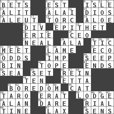 ACROSS 1. Wagers 5. Eastern Standard Time (abbr.) 8. Capri or Wight 12. Came down and settled, as after flight 13. Jai _ 15. "Vaya con ____" 16. Eskimo relative 18. Torque (variant) 19. _ vera 20. HTML Container Element 22. Curse 24. 4th largest of the Great Lakes 26. Corporate head (abbr.) 27. Actress Patricia 28. Insect wing 29. Nervous spasm 32. Rendezvous 35. Unable to walk 37. Environmental prefix 38. Probability 39. Naughty child 40. Ooze 41. Storage container 42. Drink excessively 43. Extremities 44. Ocean 45. Arrange properly for use 46. It's straight from the horse's mouth 49. Nine, plus one 50. Singer James 51. Mood resulting from idleness 55. Domesticated feline 56. Pacific island yam 57. Part of Q.E.F. 59. Inn 63. Actor Alda or Thicke 64. Have the gumption 65. Monetary unit of Yemen 66. Prong on a fork 67. Not strict 68. Elected reps. DOWN 1. Sound made by sheep 2. Pipe bend 3. Standoff 4. SAT takers 5. Erode 6. A type of plum 7. Canvas cover 8. Potato state 9. Filth; sediment 10. Plunder 11. Compass dir. 14. Ice on the eave 17. Become fatigued 21. By way of 23. Beverage made from leaves 25. American author Paul (1891-1958) 28. Electrical Unit 29. Adolescent 30. On the rocks 31. 911 reaches them 32. Crowds into 33. Singer Brickell 34. Pulitzer Prize-winning author Ferber 36. Electrical Unit 40. Legislators 42. Looked after 45. Perceive with the eye 47. And so on (abbr.) 48. Slanted text style (abbr.) 49. Heavy duty weighing machine 51. Indonesian resort city 52. Northwest Algerian city 53. Of the mouth 54. Hindu Mythology: god of death 56. Make lace 58. John Ritter's dad 60. Pass on 61. Separate the seeds from cotton 62. Raised railways