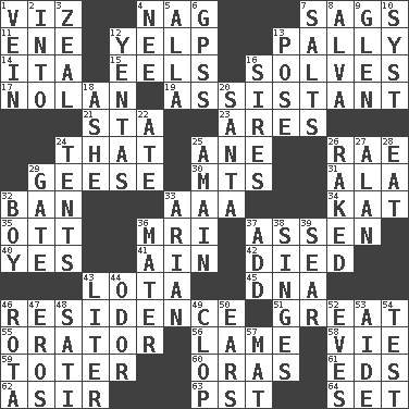 ACROSS 1. That is 4. Tired old horse 7. Sinks 11. Compass dir. 12. Sharp bark 13. Chummy 14. Call ___ day 15. Snakelike fish 16. Finds the solution 17. Pitcher Ryan 19. Aide 21. R.R. building 23. Ancient Greek god of war 24. Not this but _ 25. One (Scot) 26. Actress Charlotte 29. Honkers 30. Mountains (abbr.) 31. In the manner of 32. Prohibit 33. American Automobile Association (abbr.) 34. Krazy ___ of comics 35. Baseball player Mel 36. Medical imaging device (abbr.) 37. NE Netherlands city 40. It is so 41. The 18th letter of the Arabic alphabet 42. Passed on 43. Globular water bottle used in Asia 45. Heredity factor (abbr.) 46. Home 51. Relatively large 55. Speaker 56. Unable to walk 58. Compete 59. Carrier 60. Mouths or openings 61. Begley and Asner 62. SW Saudi Arabia district 63. Pacific Standard Time (abbr.) 64. Arrange properly for use DOWN 1. Distinctive style or manner 2. To the inside or interior of 3. Ardor 4. Born 5. Silent film actress Nazimova 6. Global Positioning Systems (abbr.) 7. Table seasonings 8. Inventor's middle name 9. Small, secluded valley 10. System (abbr.) 12. Gossips 13. Airs 16. Founders of families 18. American tennis player Robert 20. Before Barbara or Clara 22. Had dinner 24. Portable shelters 25. With great haste 26. Moved through 27. Actor Alda or Thicke 28. Consume 29. Yard entry 32. Male child 33. Believer in; advocate of (suffix) 36. Mother 37. Find the sum of 38. Burns superficially 39. Singe 43. 61 cubic inches 44. Scent 46. Roll call or roster of names 47. Greek god of love 48. Suttee (variant) 49. Hoof sound 50. Hearing organs 52. Nights before holidays 53. Helper 54. Trial 57. Floor protector