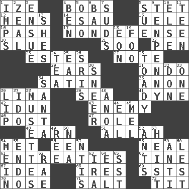 ACROSS 1. Ending with capital 4. Moves up and down 8. Proofreading order 12. Not women's 14. He sold his birthright 15. Ubangi River tributary 16. Romantic infatuation 17. Unrelated to defense, as in spending 20. Change direction abruptly 21. "Barney Miller" actor Jack 22. Fenced enclosure 23. _____ Park, CO 27. Musical sound 29. Hearing organs 31. Southwest Nigerian state 34. Smooth fabric 35. Soon (poet.) 36. Pale green bean 39. Ocean 41. Centimeter-gram-second unit of force 42. Goddess of spring and wife of Bragi 43. Foe 46. Mail 47. Hero or heavy, e.g. 48. Merit 51. Assad's deity 54. Was introduced to 56. Car or cant ending 58. Anneal 61. Pleas 66. Prong on a fork 67. The content of cognition 68. Angers 69. Fast planes 70. Characteristic smell of wine 71. Table seasoning 72. Teat (slang) DOWN 1. Naughty children 2. Ardor 3. Follow as a consequence or result 4. Benjamin's nick name 5. Bear (Spanish) 6. Bar 7. Soap bubbles 8. Institute legal proceedings 9. 3-inch nail 10. Otherwise 11. Adolescent 13. "______ My Girl" (Turtles hit) 18. Period of immesurable duration 19. Egg _ yung 24. Beverage made from leaves 25. Erode 26. Indian titles of respect 28. Sycophant 30. Contemptuous expression 32. Spanish title 33. Single 34. Before Barbara or Clara 36. Mouth edge 37. Wedding promise 38. French bagpipes 40. Small Philippine buffalo 44. Pipe bend 45. Cartoonist voice _ Blanc 49. To separate or throw off 50. Teachers' org. 52. Pismires 53. Robbery 54. Count _ (2 wds.) 55. Inside; within (prefix) 57. Nuclear Threat Initiatives 59. Against 60. For fear that 62. Actress Charlotte 63. Lyricist Gershwin 64. Snakelike fish 65. Fast jet (abbr.)