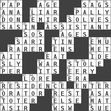 ACROSS 1. Infant food 4. Personal question 7. Settles 11. Santa ___, CA 12. One who doesn't tell the truth 13. Friendly 14. Spanish title 15. Arab leader 16. Finds the solution 17. Indian antelope 19. Aide 21. Distress signal 23. Matures 24. Indian skirt 25. Metal container 26. Australian flightless bird 29. More valued for its uncommonness 30. Followers of ems 31. Was introduced to 32. Small island 33. Erode 34. Binary compound 35. Roguish 36. Armed conflict 37. Took without asking 40. For each 41. ___ a Wonderful Life 42. Suggestive of the supernatural 43. Old wives' tales, e.g. 45. Epoch 46. Dwelling 51. Keyboard key 55. Speaker 56. Respite 58. White ___ sheet 59. Carrier 60. Otherwise 61. Floor protector 62. SW Saudi Arabia district 63. Compass dir. 64. Take to court DOWN 1. Groovy apts. 2. Small Philippine buffalo 3. Zero-star reviews 4. Direct toward a target or goal 5. Greek goddess of the earth (variant) 6. Blunders 7. Table seasonings 8. Inventor's middle name 9. Small, secluded valley 10. System (abbr.) 12. Poe poem 13. Introduce or present, as a question 16. Attaches a signature 18. Austrian river, tributary to the Danube 20. Inhabitant of Heaven 22. Title for a knight 24. Man with strong sexual desires 25. Separates forcefully 26. Poet Dickinson 27. Ancient Persian 28. Shoshoni 29. Cause heat under the collar 32. Cleo's killer 33. Consumed 36. One who wires 37. Perceive with the eye 38. Cigar-shaped 39. NW Algerian seaport 43. 61 cubic inches 44. Aroma 46. Round or rotation of duties 47. Greek god of love 48. Suttee (variant) 49. Ship's personnel 50. Snakelike fish 52. Scottish caps 53. Son of Isaac 54. Pace 57. Compass dir.