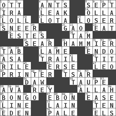 ACROSS 1. Baseball player Mel 4. Pismires 8. Back-to-school mo. 12. Retirement account (abbr.) 13. Path through which fluid escapes 14. Rounded earthenware pot or jar 15. Hang loosely or laxly 17. Globular water bottle used in Asia 18. Failure 19. Scornful expression 21. E Mali city 23. Erode 24. _____ Park, CO 26. Scottish cap 28. Shrivel 30. More given to overacting 34. Keyboard key 37. Unable to walk 39. Inside; within (prefix) 40. White ___ sheet 41. Get behind 43. Teat (slang) 44. Cause heat under the collar 46. Celtic language 47. Lion 48. Hard copy producer 51. Russian ruler of old 54. Fool 55. Grayish beige 58. Actress Gardner 61. Marina Del _, California 63. Assad's deity 65. Beat drum 67. Inky black, to poets 71. Comfort 72. Actor's bit 73. (Had) reclined 74. "___ Little Indians" 75. Genesis locale 76. Light colored 77. Raised railways DOWN 1. Petroleums 2. Marketplace scale 3. Falsehoods 4. Everything 5. Modern: prefix 6. Make lace 7. Heroin 8. "Barney Miller" actor Jack 9. Otherwise 10. Entreaty 11. Small pie 16. Allows 18. Rich soil 20. To separate or throw off 22. _ moment's notice (2 wds.) 25. Table seasoning 27. Madame (abbr.) 29. More uncommon 30. Robbery 31. International (abbr.) 32. Singer Brickell 33. Printing process, for short 34. Canvas cover 35. SW Saudi Arabia district 36. Indonesian resort city 38. Third mo. 42. For fear that 45. Conclude 49. Edible starchy tuberous root 50. She-sheep 52. American Automobile Association (abbr.) 53. Court order 56. Food holder 57. Artist's stand 58. Competent 59. Nothingness 60. Singer Murray 62. Sharp bark 64. Coop moms 66. Commissioned military rank (abbr.) 68. Sound made by sheep 69. Petroleum 70. Compass dir.
