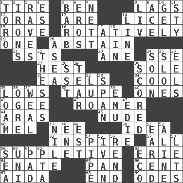 ACROSS 1. Hoop that covers a wheel 5. Benjamin's nick name 8. Falls behind 12. Mouths or openings 13. "We ___ not amused" (Victoria) 14. It is permitted: Lat. 15. Be footloose 16. Rotating or pertaining to rotation 19. Single 20. Refrain by choice 21. Fast planes 23. A saturated hydrocarbon 24. Compass dir. 27. Behest 30. Flatfish 31. Artist's stands 34. Calm and collected 35. Coldest temperatures 38. Grayish beige 40. Singles 41. Double curve, resembling the letter S 42. Nomad 44. Ancient river in northeast Turkey 45. Unadorned 46. Cartoonist voice _ Blanc 47. Born 50. The main thing one is thinking about 53. Stimulate to action 57. Everything 59. Supplying deficiencies 63. 4th largest of the Great Lakes 64. Related on the mother's side 65. Baking dish 66. Penny 67. Opera by Verdi 68. Conclude 69. Lyric poems DOWN 1. "Corrida" creature 2. Metal shackles 3. All-night dance parties 4. Compass dir. 5. Sharp remark 6. Greek god of love 7. Remaining after all deductions 8. 54 in ancient Rome 9. Adept person 10. Set 11. Filthy place 14. Actor's bit 17. American Automobile Association (abbr.) 18. Metal container 20. Toward the sea 22. College papers 24. Within a short period 25. _ gin 26. Snakelike fish 28. Fast jet (abbr.) 29. Pull apart 30. Tallied 32. Nilotic language 33. Connect, as a bridge 35. Rich soil 36. Legendary monster 37. Welt 39. Australian flightless bird 43. Singer Brickell 47. "Death on the ____" 48. Compass dir. 49. Eastern Standard Time (abbr.) 51. Having ears or earlike features 52. Place in a line 54. Corncob 55. "Terrible" tsar 56. Tear apart 58. Allows 59. Ocean 60. Corn or form start 61. Groovy apt. 62. Parent Teacher Assoc. 63. Environmental prefix