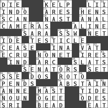 ACROSS 1. Pass on 4. Seaweed 8. Cards in a Roman deck? 11. _ china 13. Ancient Greek god of war 14. Coop moms 15. Examine minutely or intensely 16. Political cartoonist Thomas 17. Of or related to the anus 18. Devices for capturing images 21. Place in a line 22. "Two Mules for Sister ____" 23. Compass dir. 25. Fish or hair follower 26. Binary compound 29. A testis 32. Stop 34. _ tizzy (2 wds.) 35. Large container 38. Shade of tan 39. Music written for nine 41. Angers 43. Working for oneself (abbr.) 44. Curve 45. Narrow boards 46. Elected representatives 50. Put into a specified state 51. Compass dir. 54. Two (Sp.) 55. Printing process, for short 57. Hangs 59. Choose not to consume 63. Singer Murray 64. Vertical spar for supporting sails 67. Event that recurs at intervals 68. Part of speech 69. Double curve, resembling the letter S 70. Lyric poems 71. _ Lanka 72. Necklace unit 73. Erode DOWN 1. Plate 2. South American Indian 3. Dutch treat 4. Sunflower state 5. Period 6. French article 7. Pacific Standard Time (abbr.) 8. Soviet premier 1918-24 9. Empty; void 10. Small island 12. Singles 14. Actor Linden 19. Pace 20. "We ___ not amused" (Victoria) 21. Leather borer 23. Trig term 24. Scram! 26. Frozen water 27. Tenth: prefix 28. Merit 30. A color or tint 31. Tending to cause great harm 33. Beer foam 36. Caspian sea tributary 37. False hair 39. Billionth: prefix 40. Mouths or openings 42. Fast jet (abbr.) 45. Fast planes 47. Begley and Asner 48. Declaimed 49. Director Reiner 51. Connects, as a bridge 52. Sir (Sp.) 53. World-weariness 56. "Beetle Bailey" pooch 58. Lair 60. Assistant 61. It may be bright or harebrained 62. A home for chicks 64. Disorderly crowd 65. Ripen 66. Ocean