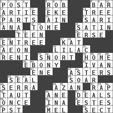 ACROSS 1. Mail 5. Director Reiner 8. Tavern 11. Nick name for Arthur 13. Make supply last 14. Relationship diagram 15. Pieces 16. The 18th letter of the Arabic alphabet 17. Indian skirt 18. Santa ___, CA 19. Heavy book 21. Smooth fabric 22. Adolescent 24. Celtic language 25. Main course 27. Krazy ___ of comics 29. Period of immesurable duration 30. Pale purple color 32. Painter Guido (1575-1642) 33. Derisive sound 35. Dwelling 39. Dark wood 41. "Terrible" tsar 42. Compass dir. 43. Michaelmas daisies 45. Lick closed 48. Fly high 49. Spanish missionary in California 50. Muslim summons to prayer 52. Hit sharply and swiftly 55. Strained 56. One (Scot) 57. Allots cards 59. Single time 60. _ tizzy (2 wds.) 61. _____ Park, CO 62. Pacific Standard Time (abbr.) 63. Cartoonist voice _ Blanc 64. Religious group DOWN 1. Dad 2. NW Algerian seaport 3. Ski resort town in Vermont 4. Teat (slang) 5. 480, 500 or 516 sheets of paper 6. Migrant worker of the '30s 7. Benjamin's nick name 8. Naughty children 9. Nest on high 10. It's straight from the horse's mouth 12. First name in cosmetics 14. Russian ruler of old 20. Single 21. Bristle 23. Bert's buddy 25. Ewer handle 26. Born 27. Apertif with cassis 28. The first octave above the treble staff 30. Myrna of the movies 31. Riviera of "Kiss of the Spider Woman" 33. Male child 34. Compass dir. 36. Make much ado about nothing 37. Make imperfect 38. Followers of ems 40. Actor Lugosi 43. White ___ sheet 44. Something which is sent 45. Actors Connery and Penn 46. Spew [out] 47. Johnson of "Laugh-In" 49. Obstruct or block passage 50. Queen of England 1702-14 51. Ardor 53. Actor Baldwin 54. Inconspicuous attention getter 56. Direct toward a target or goal 58. Curvy letter