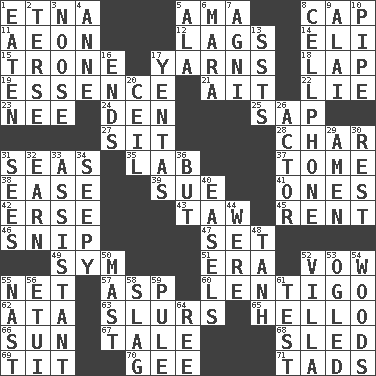 ACROSS 1. Inactive volcano in Sicily 5. Nanny (var.) 8. Head covering 11. Period of immesurable duration 12. Fails to keep up a pace 14. Connecticut Ivy Leaguer 15. Marketplace scale 17. Entertaining tales 18. Infant locale 19. Core 21. Small island 22. Whopper 23. Born 24. Lair 25. Plant excrement 27. Be seated 28. Burn to charcoal 31. Oceans 35. Experiment locale 37. Heavy book 38. Comfort 39. Take to court 41. Washington bills 42. Celtic language 43. The 23rd letter of the Hebrew alphabet 45. Monthly bill 46. Sever or remove by pinching or nipping 47. Put into a specified state 49. Symbol (abbr.) 51. Period 52. Promise 55. Fish or hair follower 57. Cleo's killer 60. Small, flat, pigmented spot on the skin 62. _ moment's notice (2 wds.) 63. Disparaging remarks 65. Phone greeting 66. Player for Phoenix 67. Lie 68. Downhill vehicle 69. Teat (slang) 70. Turn to the right 71. Small amounts or degrees DOWN 1. Consumed 2. Laconic 3. Trap for birds or small mammals 4. Queen of England 1702-14 5. Insect wing 6. Hindu Mythology: god of death 7. Hindu god of fire 8. Portable communications device 9. Mountain range southwest of Kyrgyzstan 10. Corncob 13. Fast planes 16. Extremities 17. Gossips 20. To provide with a ceiling 26. Thespian 29. So be it 30. Take ten 31. Perceives with the eye 32. Merit 33. Aide 34. Not well drained, as in land 36. On the contrary 40. Artist's stands 44. We are 48. Hyperbolic tangent 50. Vertical spar for supporting sails 52. Country residence 53. Stared 54. Forest 55. Political cartoonist Thomas 56. Needle case 58. Volcanic refuse 59. Whimper 61. Trial 64. To sift