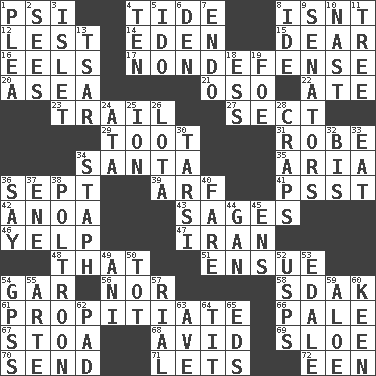 ACROSS 1. Air pressure measure (abbr.) 4. Event that recurs at intervals 8. Is not 12. For fear that 14. Locale of original sin 15. Letter starter 16. Snakelike fish 17. Unrelated to defense, as in spending 20. At sea 21. Bear (Spanish) 22. Had dinner 23. Hang back 27. Religious group 29. A blast of a horn 31. Loose flowing garment 34. Before Barbara or Clara 35. Roberta Peters solo 36. Back-to-school mo. 39. Sandy's bark 41. Inconspicuous attention getter 42. Small Philippine buffalo 43. Gurus 46. Sharp bark 47. SW Asia republic 48. Not this but _ 51. Follow as a consequence or result 54. Slender fish 56. Or not 58. Neighbor of Neb. 61. Conciliate 66. Diluted with white 67. Portico 68. Enthusiastic 69. _ gin 70. Transmit 71. Allows 72. Car or cant ending DOWN 1. Entreaty 2. Observes 3. Small island 4. "___ Little Indians" 5. Wedding promise 6. Lair 7. Inside; within (prefix) 8. Binary compound 9. Elected representatives 10. Political cartoonist Thomas 11. Relationship diagram 13. Russian ruler of old 18. Double-curved letter 19. Enemy 24. "One Day ___ Time" 25. Electrically charged atom 26. Globular water bottle used in Asia 28. Dice game 30. Tarsus (plural) 32. Altar cloth linen 33. Ingest 34. Staphylococcus 36. Declare 37. Compass dir. 38. Coward 40. Conductor's collection 44. Separate the seeds from cotton 45. Followers of ems 49. Cuckoo 50. Small child 52. United States Postal Service (abbr.) 53. Peak District village in England 54. Global Positioning Systems (abbr.) 55. Johnson of "Laugh-In" 57. Monetary unit of Yemen 59. _ vera 60. Peachy ____! 62. Groovy apt. 63. "___ Maria" 64. Teat (slang) 65. Begley and Asner