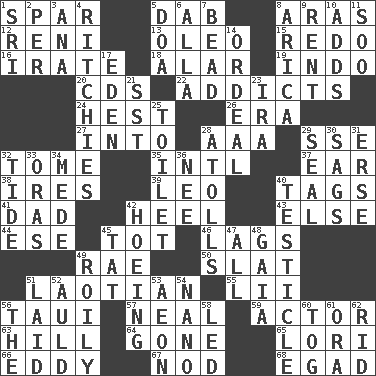 ACROSS 1. Coast Guard woman 5. Apply (a substance) by light strokes 8. Caspian sea tributary 12. Painter Guido (1575-1642) 13. Butter sub 15. Do over again 16. Feeling or showing extreme anger 18. Having or resembling wings 19. Southeast Asian peninsula 20. Music discs 22. Inveterate users 24. Command 26. Epoch 27. To the inside or interior of 28. American Automobile Association (abbr.) 29. Compass dir. 32. Heavy book 35. International (abbr.) 37. Hearing organ 38. Angers 39. Lion 40. Labels 41. June honoree 42. The bottom of a shoe or boot 43. Otherwise 44. Compass dir. 45. Small child 46. Fails to keep up a pace 49. Actress Charlotte 50. Narrow board 51. Of or relating to Laos or its people 55. Cards in a Roman deck? 56. "Change" in Tahitian 57. Be tempered by heat 59. Thespian 63. Land elevation 64. Went 65. Australian parrot (variant) 66. Whirlpool 67. Allow head to fall sleepily 68. Mild oath DOWN 1. _ Lanka 2. For each 3. Santa ___, CA 4. Actors Guy, Robert Welles, and Clint 5. ___ good deed 6. Silent film actress Nazimova 7. Necklace unit 8. N. Chile seaport 9. Monthly bill 10. Sums up 11. "Barney Miller" actor Jack 14. Severe or trying experience 17. Genesis locale 21. Fast jet (abbr.) 23. Retirement account (abbr.) 25. Rest room 28. Ringlike coral islands and reefs 29. Lick closed 30. Droops 31. Celtic language 32. Periodic rise and fall of the sea level 33. Mouths or openings 34. Ancient Persian 36. Born 40. One of the two male reproductive glands 42. Cultivating 45. Make lace 47. Everything 48. Greek goddess of the earth (variant) 49. Turbulent 51. Put down 52. Old (Scot.) 53. A really long time 54. Billionth: prefix 56. Definite Article 58. Directed 60. Coat; cloak 61. Mouth or opening 62. To free from