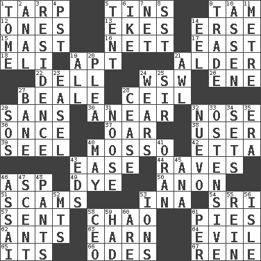 ACROSS 1. Canvas cover 5. Canisters 9. Scottish cap 12. Washington bills 13. Supplements with great effort 14. Celtic language 15. Vertical spar for supporting sails 16. Remaining after all deductions 17. Compass direction 18. Biblical high priest 19. Fitting 21. Tree or shrub in the Birch family 22. Small valley 24. Compass dir. 26. Compass dir. 27. Calif. Air Force Base 28. To provide with a ceiling 29. Without 30. Approach 32. Sense of smell 36. At one time in the past 37. Rowing implement 38. One who makes use of a thing 39. Stitch closed the eyes of (a falcon) 40. With motion or animation 42. Singer James 43. Comfort 44. All-night dance parties 46. Viper 49. Color 50. At once, immediately (arch.) 51. Fraudulent business schemes 53. _ tizzy (2 wds.) 54. _ Lanka 57. Emitted 58. US Secretary of Labor Elaine L. _ 61. Sliced desserts 62. Pismires 63. Merit 64. Tending to cause great harm 65. ___ a Wonderful Life 66. Lyric poems 67. French philosopher Descartes DOWN 1. Heavy book 2. Of or related to the anus 3. Dwelling 4. Pacific Standard Time (abbr.) 5. Portable shelter 6. Mamie's husband 7. Fish or hair follower 8. Fast jet (abbr.) 9. Swap 10. NE Netherlands city 11. Distance measurement (Brit.) 14. Snakelike fish 19. Everything 20. Entreaty 21. Leather borer 23. Artist's stand 24. Erodes 25. Title for a knight 27. Object of repulsion 28. Desist 29. Distress signal 31. Trap for birds or small mammals 32. New (sp.) 33. Clearly or manifestly demonstrative 34. Puts into a specified state 35. Epoch 40. Can I? 41. NW Algerian seaport 43. Begley and Asner 45. Santa ___, CA 46. Slender Brazilian palm 47. Aroma 48. Leg coverings 52. Mountains (abbr.) 53. Charged particles 55. It's straight from the horse's mouth 56. Small island 58. Corporate head (abbr.) 59. Possessed 60. "We ___ not amused" (Victoria) 61. For each