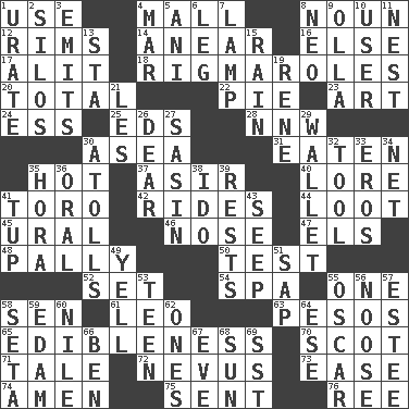 ACROSS 1. Purpose 4. Promenade 8. Part of speech 12. Basketball hoops 14. Approach 16. Otherwise 17. Set down 18. Frustrating wastes of time 20. "_____ Recall" 22. Sliced dessert 23. Nonscientific branch of learning 24. Double-curved letter 25. Begley and Asner 28. Compass dir. 30. Toward the sea 31. Consumed 35. Being at a high temperature 37. SW Saudi Arabia district 40. Old wives' tales, e.g. 41. "Corrida" creature 42. Amusement-park features 44. Spoils 45. Mountain range 46. Sense of smell 47. Raised railways 48. Friendly 50. Trial 52. Put into a specified state 54. Health resort 55. Single 58. Elected rep. 61. Lion 63. Mexican monetary units 65. The property of being fit to eat 70. Native of Scotland 71. Lie 72. Congenital growth or mark on the skin 73. Comfort 74. So be it 75. Posted 76. To riddle DOWN 1. A salt of uric acid 2. Grain storage towers 3. Gives off 4. Impair 5. Black tropical American cuckoo 6. Part of a journey 7. Desk light 8. Modern: prefix 9. Water jar 10. One who makes use of a thing 11. Egg locale 13. R.R. building 15. Water falling in drops from the sky 19. French philosopher Descartes 21. French article 26. Letter starter 27. Indian antelope 29. Place for singles 30. Ringlike coral islands and reefs 32. Implement 33. Greek god of love 34. Fish or hair follower 35. Israeli folk dance 36. Of the mouth 38. Wedding promise 39. Musical pauses 41. Uncastrated adult male sheep 43. Ooze 49. Shout 51. Plant excrement 53. Adolescent 55. Motion picture award 56. Trap for birds or small mammals 57. First name in cosmetics 58. Bristle 59. Dutch treat 60. Mediterranean tributary 62. Washington bills 64. Compass dir. 66. Benjamin's nick name 67. Night before a holiday 68. Player for Phoenix 69. Fast jet (abbr.)