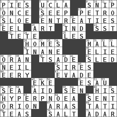 ACROSS 1. Sliced desserts 5. Southern CA. univ. 9. Clip 13. Single time 14. Ooze 15. Stone: prefix 16. _ gin 17. Pleas 19. Snakelike fish 20. Tate display 21. Working for oneself (abbr.) 22. Fast jet (abbr.) 23. False hair 25. French article 26. Residences 30. Promenade 34. Empty; void 35. Writer Wiesel 36. Northwest Algerian city 39. Sadhe (variant) 42. Downhill vehicle 43. Famous astronaut Armstrong 44. Founders of families 46. Suggestive of the supernatural 47. Elude 48. Supplement with great effort 51. He sold his birthright 54. Ocean 57. Assist 58. Elected rep. 60. Part of HMS, perhaps 62. Abnormally rapid or deep breathing 65. Emitted 66. Greek mythologigal hunter 67. Ancient river in northeast Turkey 68. Jacques of French films 69. Afternoon social gatherings 70. Table seasoning 71. The sixth month of the Jewish calendar DOWN 1. Airs 2. An arm off of a larger body of water 3. Learning spot: Fr. 4. Perceive with the eye 5. One who makes use of a thing 6. Penny 7. Allow 8. Showery time 9. Put into a specified state 10. Nuclear Threat Initiatives 11. Angers 12. Mail 15. Groovy apts. 18. Compass dir. 20. A really long time 24. Without thickness 27. Floor covering 28. Followers of ems 29. Gospel singer Marvin 30. Makes clutter 31. Everything 32. Whopper 33. Directed 36. Single 37. Portuguese money of account (variant) 38. Atmosphere 40. HTML Container Element 41. Epoch 45. Genesis locale 48. Merit 49. Monetary unit of Laos 50. Ferber et al. 52. Forward in time 53. National forest in Provo, Utah 54. Attempt 55. Jane of fiction 56. Capital of Western Samoa 58. Lick closed 59. Compass direction 61. Tumult 63. Greek goddess of the dawn 64. Mouth or opening 65. R.R. building