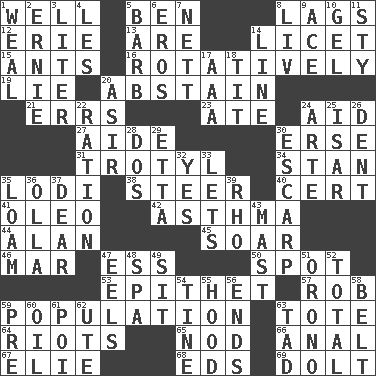 ACROSS 1. Not ill 5. Benjamin's nick name 8. Falls behind 12. One of the Great Lakes 13. "We ___ not amused" (Victoria) 14. It is permitted: Lat. 15. Pismires 16. Rotating or pertaining to rotation 19. Untruth 20. Refrain by choice 21. Blunders 23. Had dinner 24. Help 27. Assistant 30. Celtic language 31. TNT 34. Comedian Laurel of Laurel & Hardy 35. Farming town in central California 38. Guide 40. Certainty 41. Butter sub 42. Respiratory problem 44. ____ Jay Lerner 45. Fly high 46. Impair 47. Curvy letter 50. Specific locale 53. Curse 57. Director Reiner 59. Census information 63. Carryall 64. Debaucheries 65. Lower and raise head in agreement 66. Of or related to the anus 67. Writer Wiesel 68. Begley and Asner 69. Dunce DOWN 1. Welt 2. Bert's buddy 3. 61 cubic inches 4. French article 5. Sharp remark 6. Greek god of love 7. Remaining after all deductions 8. 54 in ancient Rome 9. Adept person 10. Set 11. Filthy place 14. Actor's bit 17. Auto club (abbr.) 18. Teat (slang) 20. SW Saudi Arabia district 22. Food allowance for one day 24. Johnson of "Laugh-In" 25. Austrian river, tributary to the Danube 26. Incision 28. Two (Sp.) 29. Singer James 30. Fortification 32. Affirmative reply 33. Allows 35. Rich soil 36. Rounded earthenware pot or jar 37. Letter starter 39. 17th letter of the Greek alphabet 43. Vertical spar for supporting sails 47. Snakelike fish 48. Health resort 49. Be seated 51. U. of Maine site 52. "_____ Recall" 54. Prong on a fork 55. Parka part 56. Conclusions 58. Waist strap 59. Before (prefix) 60. Lubricate 61. Luau course 62. Shoshoni 63. Small boy