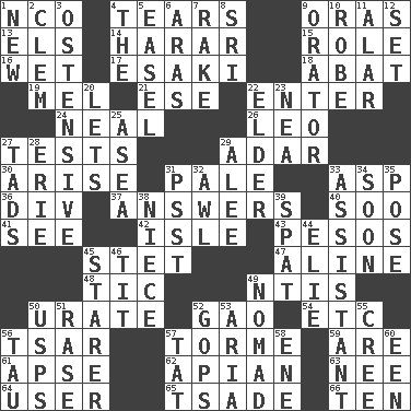 ACROSS 1. Non-commissioned officer (abbr.) 4. Rends 9. Mouths or openings 13. Raised railways 14. Ethiopian city, capital of Harari 15. Hero or heavy, e.g. 16. Soggy 17. 1973 Nobel Price Winner (Physics) Leo 18. Blind as ____ 19. Cartoonist voice _ Blanc 21. Compass dir. 22. Keyboard key 24. Anneal 26. Lion 27. Trials 29. The sixth month of the Jewish calendar 30. Originate 31. Diluted with white 33. Viper 36. HTML Container Element 37. Responds (to) 40. "Barney Miller" actor Jack 41. Perceive with the eye 42. Capri or Wight 43. Mexican monetary units 45. Proofreading order 47. Place in a line 48. Nervous spasm 49. Nuclear Threat Initiatives 50. A salt of uric acid 52. E Mali city 54. And so on (abbr.) 56. Russian ruler of old 57. Singer Mel 59. "We ___ not amused" (Victoria) 61. Domed church section 62. Bee-related 63. Born 64. One who makes use of a thing 65. Sadhe (variant) 66. "___ Little Indians" DOWN 1. ___ Haven, CT 2. Clement's nick name 3. Clearly or manifestly demonstrative 4. Definite Article 5. Artist's stand 6. Ancient river in northeast Turkey 7. Immoral or dissolute person 8. Indian title of respect (Mr.) 9. Speaker 10. Loose flowing garment 11. Having or resembling wings 12. Put into a specified state 20. Allows 22. A person who is older than you are 23. Teachers' org. 25. At sea 27. Small amounts or degrees 28. One of the Great Lakes 29. Toward shelter 31. Inconspicuous attention getter 32. Leather borer 33. Helper 34. Within a short period 35. Introduce or present, as a question 38. Sibling's daughter 39. Argument over a trivial matter 44. Writer Wiesel 45. A viewer who gazes fixedly 46. Teat (slang) 49. Wanderer 50. United States Postal Service (abbr.) 51. To erase 52. Republicans 53. Roberta Peters solo 55. Algonquian 56. The 19th letter of the Greek alphabet 57. Make lace 58. Compass dir. 60. Car or cant ending