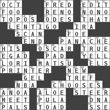 ACROSS 1. Sep. follower 4. Flintstone 8. Prepare for publication 12. Egg _ yung 13. Former U.S. Attorney General Janet 14. Words to Nanette 15. Literary convention 18. Lyric poems 19. Not this but _ 20. Small, flat, pigmented spot on the skin 22. Lyricist Gershwin 23. Examine minutely or intensely 24. Enemy 25. Conclude 26. Flamboyance 30. Part of HMS, perhaps 33. Witty Wilde 36. Loyal 37. Mild oath 39. Groovy apt. 40. Shout 41. Australian parrot (variant) 42. Taiwanese island in East China Sea 44. Raised railways 45. Hard copy producer 47. ___ Haven, CT 50. Set 51. Not kosher 53. Basketball assoc. 54. Elects 57. Small Philippine buffalo 59. Medicinal plant 61. Navigate 63. Rendezvous 64. Monetary unit of Botswana 65. Heredity factor (abbr.) 66. Friends 67. Frog relative 68. Compass dir. DOWN 1. Often (poetically) 2. Calm and collected 3. Drinks excessively 4. Tree-dwelling hopper 5. Redecorate 6. Compass dir. 7. Two (Sp.) 8. Plea 9. Capital of the state of Qatar 10. _ tizzy (2 wds.) 11. Small child 16. Single time 17. Comedian Laurel of Laurel & Hardy 21. Southeast Asian peninsula 22. Electrically charged atom 24. Distant 26. Groovy apts. 27. Algonquian 28. Frame or body of a ship 29. Snakelike fish 30. Assist 31. Russian composer Stravinsky 32. Indian skirt 34. Coast Guard woman 35. Feline 38. Empty-headed or silly people 42. Cartoonist voice _ Blanc 43. To (old English) 46. Afternoon social gathering 48. Greek god of love 49. Compass direction 52. Eats 53. Christmas carol 54. Root beer relative 55. Froth on beer 56. Elected reps. 57. Electrical Unit 58. Teachers' org. 59. Fitting 60. Nilotic language 62. Actress Charlotte