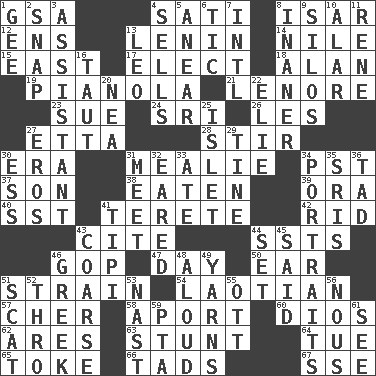 ACROSS 1. Girls' org. (abbr.) 4. Suttee (variant) 8. Austrian river, tributary to the Danube 12. Followers of ems 13. Soviet premier 1918-24 14. The longest river in the world 15. 90 degrees 17. Opt 18. Actor Alda or Thicke 19. Player piano 21. Poe poem 23. Take to court 24. Indian title of respect (Mr.) 26. French article 27. Singer James 28. Agitate 30. Period 31. Ear of corn 34. Pacific Standard Time (abbr.) 37. Manchild 38. Eroded 39. Mouth or opening 40. Fast jet (abbr.) 41. Cylindrical with tapered ends 42. To free from 43. Quote 44. Fast planes 46. Grand Old Party 47. 24 hours 50. Ewer handle 51. Put through a sieve 54. Of or relating to Laos or its people 57. "Mermaids" star 58. To the left, to Queeg 60. "Vaya con ____" 62. Ancient Greek god of war 63. Check the growth or development of 64. Third day of the wk. 65. Puff or smoke 66. Small boys 67. Compass dir. DOWN 1. Unit of force equal to gravity 2. Fastener 3. Helper 4. Exchanges for money 5. Approach 6. Nervous spasm 7. International (abbr.) 8. Sillier 9. Grain storage towers 10. Having or resembling wings 11. French philosopher Descartes 13. Lion 16. Pulled tight 20. Teachers' org. 22. Writer Wiesel 25. Small island 27. Greek god of love 29. Prong on a fork 30. Curvy letter 31. Confront 32. Having ears or earlike features 33. Had dinner 34. Likenesses of persons 35. Indian titles of respect 36. Small amount or degree 41. Native american tent (variation) 43. Unrefined 44. Arrange properly for use 45. Stated 46. Hellenic 48. Verbally 49. Entertaining tales 51. Scram, to a cat 52. Through, poetically 53. Political cartoonist Thomas 55. Baseball player Mel 56. Good sense 59. Parent Teacher Association (abbr.) 61. Observe