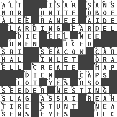 ACROSS 1. The first octave above the treble staff 4. Austrian river, tributary to the Danube 8. Without 12. And not 13. Join together 14. Mitch Miller's instrument 15. Toward shelter 17. Indian princess (variant) 18. Helper 19. Preparing or cooking with lard 21. Pack 23. Expire 24. Snakelike fish 26. Born 27. Presage 28. On the rocks 30. _ Lanka 31. Manatee 34. 4-wheeled motor vehicle 37. Actor Linden 38. An arm off of a larger body of water 39. Mouth or opening 40. Pipe bend 41. Make 42. Atlas unit 43. South Vietnam president (1954) 44. Balmoral and tarboosh 46. Car dealer's back yard 47. It is so 50. Bear (Spanish) 51. Sowing specialist 54. Nestling 57. Volcanic refuse 58. Slender Brazilian palm 60. 480, 500 or 516 sheets of paper 62. Hoop that covers a wheel 63. Check the growth or development of 64. Teachers' org. 65. Elected reps. 66. Snake ____ (dice throw) 67. Affectionate concern, for short DOWN 1. Santa ___, CA 2. Hang loosely or laxly 3. Excercise machine 4. Silly 5. Scorch 6. Had dinner 7. Coral collection 8. Flew 9. Stay 10. Thickened enlargement 11. Stitch closed the eyes of (a falcon) 13. RI univ. 16. One of the Great Lakes 20. Lair 22. Afresh 25. It is permitted: Lat. 27. Relating to the mouth 29. ____ d'Azur (French Riviera) 30. A female animal or person 31. Beget 32. Foe 33. Chicken ___ king 34. Piece 35. Ancient river in northeast Turkey 36. Strike 41. Quote 43. Evades 44. Small bed 45. SW Saudi Arabia district 46. Memorize 48. Follow as a consequence or result 49. Actors Connery and Penn 51. Fast planes 52. Writer Wiesel 53. Raze (variant) 55. Be seated 56. Highlander 59. Filthy place 61. Big _