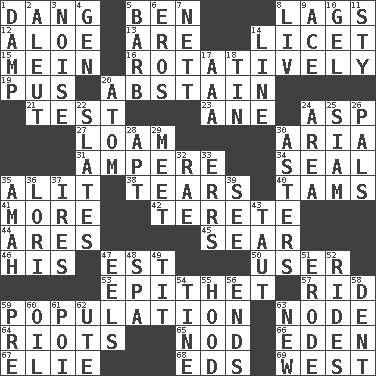 ACROSS 1. Mild oath, euphamism for damn 5. Benjamin's nick name 8. Fails to keep up a pace 12. Medicinal plant 13. "We ___ not amused" (Victoria) 14. It is permitted: Lat. 15. Chow _ 16. Happening in regular succession 19. Suppuration 20. Refrain by choice 21. Trial 23. One (Scot) 24. Viper 27. Rich soil 30. Operatic vocal solo 31. Electrical Unit 34. Lick closed 35. Came down and settled, as after flight 38. Separates forcefully 40. Scottish caps 41. Greater amount 42. Cigar-shaped 44. Ancient Greek god of war 45. Burn superficially 46. Part of HMS, perhaps 47. Eastern Standard Time (abbr.) 50. One who makes use of a thing 53. Curse 57. To free from 59. Census information 63. Connecting point 64. Debaucheries 65. Allow head to fall sleepily 66. Genesis locale 67. Writer Wiesel 68. Begley and Asner 69. 270 degrees DOWN 1. Moist 2. Native American of Southwest Alaska 3. Annoying sound 4. Commissioned mil. rank 5. Sharp remark 6. Greek god of love 7. Remaining after all deductions 8. 54 in ancient Rome 9. Adept person 10. Set 11. Filthy place 14. Actor's bit 17. American Automobile Association (abbr.) 18. Shallow baking pan 20. Tiny particle 22. Chalkboards 24. Type of rug 25. Thailand, formerly 26. Friends 28. Fitting 29. Rendezvous 30. Michaelmas daisies 32. Actress Charlotte 33. Blunders 35. Housemaid 36. Australian parrot (variant) 37. Angers 39. Perceive with the eye 43. Drawn tight 47. Snakelike fish 48. Health resort 49. Teat (slang) 51. Wear away 52. Amusement-park features 54. Prong on a fork 55. Parka part 56. Conclusions 58. Gouge 59. Before (prefix) 60. Petroleum 61. Luau course 62. Shoshoni 63. ___ Haven, CT