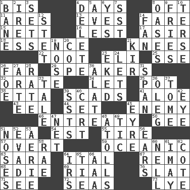 ACROSS 1. Again 4. 24-hour periods 8. Often (poetically) 11. Ancient Greek god of war 13. Nights before holidays 14. Conductor's collection 15. Remaining after all deductions 16. For fear that 17. SW Saudi Arabia district 18. Gist 21. Leg joints 22. A blast of a horn 23. Connecticut Ivy Leaguer 25. Compass dir. 26. At a great distance 29. Orators 32. Declaim 34. Allow 35. Cooking vessel 38. Singer James 39. Heaps 41. _ vera 43. Snakelike fish 44. Arrange properly for use 45. Foe 46. Plea 50. Unit of force equal to gravity 51. Teachers' org. 54. Eastern Standard Time (abbr.) 55. Become fatigued 57. Unconcealed 59. Pertaining to the sea 63. "Two Mules for Sister ____" 64. Slanted text style (abbr.) 67. San ____ (Riviera town) 68. Singer Brickell 69. Monetary unit of Yemen 70. Narrow board 71. Perceive with the eye 72. Oceans 73. Potassium hydroxide DOWN 1. Object of repulsion 2. Angers 3. Puts into a specified state 4. Erase 5. "___ Maria" 6. It is so 7. Fast jet (abbr.) 8. Fertile tracts in a desert 9. Strips of potato fried in deep fat 10. Laconic 12. Proofreading order 14. Avid follower 19. Olfactory organ 20. Police officer (slang) 21. Apertif with cassis 23. Supplemented with great effort 24. Allows 26. Enemy 27. Johnson of "Laugh-In" 28. Pace 30. Having winglike extensions 31. Connect, as a bridge 33. Falsehood 36. Cassini of fashion 37. Heavy book 39. Fast planes 40. Sure thing 42. Sight organ 45. Jane of fiction 47. Fish or hair follower 48. Ringlike coral islands and reefs 49. Nervous spasm 51. Olfactory organs 52. Elude 53. Nest on high 56. Hearing organs 58. Actress Charlotte 60. 1994 drama film starring Jodie Foster 61. "If ____ say so..." 62. ____ d'Azur (French Riviera) 64. Big collection agency 65. Standoff 66. Auto club (abbr.)