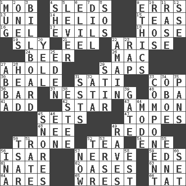 ACROSS 1. Crowd into 4. Bobsleighs 9. Blunders 13. Corn or form start 14. Sun: prefix 15. Afternoon social gatherings 16. Set 17. Vices 18. Flexible conduit 19. Cunning 21. Snakelike fish 22. Get up 24. Fermented drink made from hops 26. Big _ 27. Hold, grip (Informal) 29. Plant excrements 30. Memphis, Tenn. Street 31. Suttee (variant) 33. Police officer (slang) 36. Long, evenly shaped piece 37. Snuggling 40. Chief or king in Benin or Nigeria 41. Say or write further 42. Play the lead 43. ID or VA city 45. Arranges properly for use 47. Drinks excessively 48. Born 49. Redecorate 50. Heavy duty weighing machine 52. Afternoon social gathering 54. Compass dir. 56. Austrian river, tributary to the Danube 57. Effrontery 59. Begley and Asner 61. Nathan's nickname 62. Fertile tracts in a desert 63. Compass dir. 64. Ancient Greek god of war 65. Take or capture by force 66. Make lace DOWN 1. Java container 2. Singles 3. Big road sign 4. A female animal or person 5. Prying instrument 6. Writer Wiesel 7. Deli pickle 8. Distress signal 9. Moral principles 10. Vintage cars 11. To erase 12. Compass dir. 20. Shout 22. With great haste 23. Reproach for some lapse or misdeed 25. Paradise 27. Swedish rock group 28. Froth on beer 29. Use a swizzle stick 31. Fast planes 32. _ moment's notice (2 wds.) 33. Part 34. Mitch Miller's instrument 35. Zero-star reviews 38. First name in cosmetics 39. Yard entry 44. Method 45. Sounds asleep 46. Car or cant ending 49. All-night dance parties 50. Russian ruler of old 51. Pace 52. Pull apart 53. Celtic language 55. Pulitzer Prize-winning author Ferber 56. _ tizzy (2 wds.) 57. Immediately 58. Eastern Standard Time (abbr.) 60. Arrange properly for use