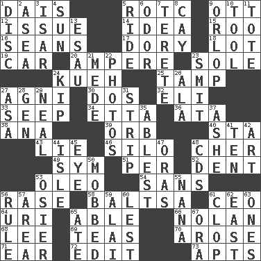 ACROSS 1. Raised platform 5. College mil. group 9. Baseball player Mel 12. Come out of 14. It may be bright or harebrained 15. Friend of Pooh 16. Seines 17. Rowboat 18. Car dealer's back yard 19. Auto 20. Electrical Unit 23. Flatfish 24. Malaysian steamed pastry 25. Pack (down) 27. Hindu god of fire 30. Two (Sp.) 32. Connecticut Ivy Leaguer 33. Ooze 34. Singer James 36. _ moment's notice (2 wds.) 38. Santa ___, CA 39. Globe 40. R.R. building 43. Falsehood 46. Grain storage tower 48. "Mermaids" star 49. Symbol (abbr.) 51. For each 52. Scratch 53. Margarine 54. Without 56. To erase 58. Greek mezzo-soprano Agnes 61. Corporate head (abbr.) 64. RI univ. 65. Competent 66. Pitcher Ryan 68. Area sheltered from the wind 69. Afternoon social gatherings 70. Came up 71. Hearing organ 72. Prepare for publication 73. Flats, for short DOWN 1. Flat circle 2. At sea 3. Austrian river, tributary to the Danube 4. Player for Phoenix 5. Travel on an animal 6. Scent 7. Cigar-shaped 8. Island 9. Lowest deck of a ship 10. Instrument 11. Lug 13. He sold his birthright 21. Ancient Persian 22. Pictures 23. Stricken, poetically 24. Monetary unit of Laos 26. Insect wing 27. White ___ sheet 28. Commissioned mil. rank 29. Be tempered by heat 31. Long narrow piece of something 35. Most capable 37. American tennis player Robert 41. "___ Little Indians" 42. Tate display 44. Capri or Wight 45. Sight organ 47. Mouths or openings 48. Music discs 50. Crowded into 53. Flexible twig of a willow tree 55. Grandmother 56. Court order 57. Type of rug 59. Jai _ 60. For fear that 61. Hoof sound 62. 90 degrees 63. Washington bills 65. Had dinner 67. Mouth or opening