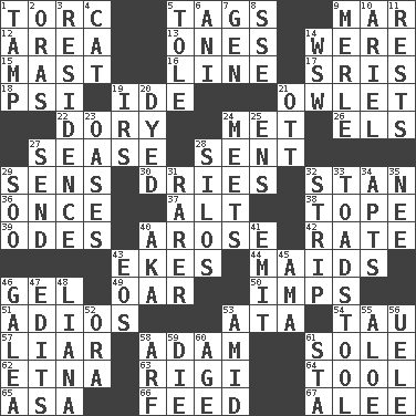 ACROSS 1. Torque (variant) 5. Labels 9. Spoil 12. Length times width 13. Singles 14. Past tense of be (plural) 15. Vertical spar for supporting sails 16. Actor's bit 17. Indian titles of respect 18. Air pressure measure (abbr.) 19. Binary compound 21. A small or young owl 22. Dinghy 24. Was introduced to 26. Raised railways 27. Gospel singer Marvin 28. Transmitted 29. Elected reps. 30. Frees from moisture 32. Comedian Laurel of Laurel & Hardy 36. Single time 37. The first octave above the treble staff 38. Drink excessively 39. Lyric poems 40. Came up 42. Assign a rank or rating to 43. Makes supply last 44. Unmarried girls 46. Set 49. Rowing implement 50. Naughty children 51. Goodbye (Sp.) 53. "One Day ___ Time" 54. The 19th letter of the Greek alphabet 57. One who doesn't tell the truth 58. First man 61. Not divided or shared with others 62. Inactive volcano in Sicily 63. Swiss mountan, "Queen of the Mountains" 64. Implement 65. White ___ sheet 66. Nourish 67. Toward shelter DOWN 1. Pack (down) 2. Mouths or openings 3. Dwelling 4. Domesticated feline 5. Lacquered or enameled metalware 6. Black tropical American cuckoo 7. Commissioned military rank (abbr.) 8. Compass dir. 9. Haggard of country music 10. Satellite of Uranus 11. Musical pauses 14. Compass dir. 19. Big collection agency 20. Colored 21. Baseball player Mel 23. Fertile tracts in a desert 24. Confronts 25. Followers of ems 27. Post 28. Grain storage towers 29. "Barney Miller" actor Jack 31. More uncommon 32. Empty completely 33. Inedible or poisonous agaric 34. Tenement units (abbr.) 35. Born 40. Alias (abbr.) 41. Send forth 43. Greek goddess of the dawn 45. Housemaid (var.) 46. An organ shaped like a helmet 47. Proofreads 48. Woody, climbing, usually tropical plant 52. Mouth or opening 53. Among 55. Medicinal plant 56. Ubangi River tributary 58. Sandy's bark 59. Expire 60. Personal question 61. R.R. building