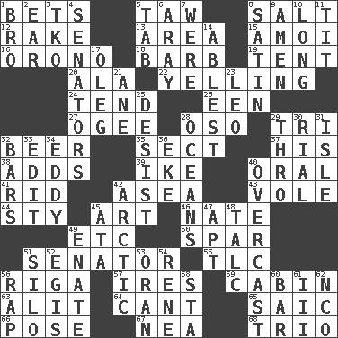 ACROSS 1. Wagers 5. The 23rd letter of the Hebrew alphabet 8. Table seasoning 12. Libertine 13. Type of rug 15. Mine, in Marseilles 16. U. of Maine site 18. Sharp remark 19. Portable shelter 20. In the manner of 22. Crying or shouting loudly 24. Be inclined (to) 26. Car or cant ending 27. Double curve, resembling the letter S 28. Bear (Spanish) 29. Three (prefix) 32. Fermented drink made from hops 35. Religious group 37. Part of HMS, perhaps 38. Does sums 39. Mamie's mate 40. Taken by mouth 41. To free from 42. At sea 43. Short-tailed, large-bodied rat 44. Filthy place 45. Nonscientific branch of learning 46. Nathan's nickname 49. And so on (abbr.) 50. Practice fight 51. Legislator 55. Affectionate concern, for short 56. Capital of Latvia 57. Angers 59. Small house or cottage 63. Came down and settled, as after flight 64. Patter 65. Ketch in the Levant 66. Introduce or present, as a question 67. Teachers' org. 68. Musical group of three DOWN 1. Sis' sibling 2. Hearing organ 3. Ring climax 4. Elected representatives 5. Keyboard key 6. Like ___ of sunshine 7. We are 8. Smooth fabric 9. So be it 10. Protracted 11. Teat (slang) 14. Most capable 17. Cassini of fashion 21. A saturated hydrocarbon 23. Lion 25. Cease 28. Seas 29. Through, poetically 30. Monetary unit of Yemen 31. Small island 32. Oblong pieces of solid material 33. Prepare for publication 34. Whirlpool 36. Supplement with great effort 40. Cloudy 42. Northern region 45. "One Day ___ Time" 47. Fitting 48. Baby powder 49. Maternal 51. Grain storage tower 52. Armor plate that protects the chest 53. NW Algerian seaport 54. French philosopher Descartes 56. Strike 58. R.R. building 60. Soap unit 61. One more than two 62. Non-commissioned officer (abbr.)