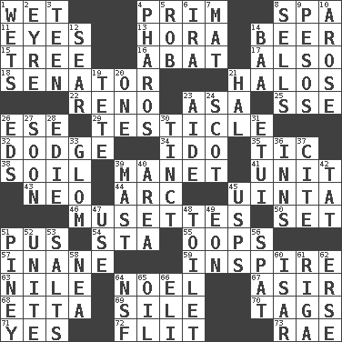ACROSS 1. Dripping 4. Demure 8. Health resort 11. Sight organs 13. Israeli folk dance 14. Fermented drink made from hops 15. Relationship diagram 16. Blind as ____ 17. In addition 18. Elected representative 21. Auras 22. Western Nevada city 23. White ___ sheet 25. Compass dir. 26. Compass dir. 29. One of the two male reproductive glands 32. Evade 34. Wedding promise 35. Nervous spasm 38. The visible part of the earth's surface 39. French painter Edouard 41. A single undivided whole 43. Modern: prefix 44. Curve 45. National forest in Provo, Utah 46. French bagpipes 50. Arrange properly for use 51. Purulenc 54. R.R. building 55. I made a mistake 57. Silly 59. Heighten or intensify 63. "Death on the ____" 64. Christmas carol 67. SW Saudi Arabia district 68. Singer James 69. Filth; sediment 70. Labels 71. It is so 72. Secret move to avoid paying debts 73. Actress Charlotte DOWN 1. Moistens 2. Jane of fiction 3. Adolescent 4. N Egypt peninsula 5. Director Reiner 6. Lyricist Gershwin 7. Floor covering 8. Exchanges for money 9. Mexican monetary units 10. Came up 12. Dry up 14. Sound made by sheep 19. Wig 20. Single 21. Actor Linden 23. Assistant 24. Native of Scotland 26. Begley and Asner 27. Within a short period 28. Singer Brickell 30. Colored lightly or faintly 31. Needle case 33. Seize upon or latch onto something 36. Restaurants 37. Quote 39. Vertical spar for supporting sails 40. Length times width 42. Make lace 45. United States Postal Service (abbr.) 47. Purpose 48. Bathroom plumbing fixture 49. Period of immesurable duration 51. Abounding in pines 52. Join together 53. Table seasonings 56. Petty quarrel 58. Teachers' org. 60. Austrian river, tributary to the Danube 61. Capital of Latvia 62. Celtic language 64. Science/research agcy. 65. Lubricate 66. Biblical high priest