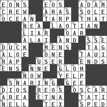 ACROSS 1. Immeasurably long periods of time 5. Greek goddess of the dawn 8. First man 12. Ship's personnel 13. Caspian sea tributary 15. Flatfish 16. Sea 18. Canvas cover 19. Not this but _ 20. Teachers' org. 22. Of or relating to Laos or its people 24. One who doesn't tell the truth 26. Rowing implement 27. Jai _ 28. Also 29. Compass dir. 32. Evade 35. Not women's 37. Label 38. _ vera 39. Single 40. "Change" in Tahitian 41. Strike 42. One who makes use of a thing 43. Conclusions 44. Followers of ems 45. Compass dir. 46. Take by theft 49. Immediately 50. Sharp bark 51. Catching in a trap 55. Turn to the right 56. "Vaya con ____" 57. Vintage cars 59. Witty Wilde 63. Length times width 64. Inactive volcano in Sicily 65. Jacques of French films 66. 1994 drama film starring Jodie Foster 67. John Ritter's dad 68. Broke a traffic law DOWN 1. Environmental prefix 2. The grampus (Milton) 3. Born 4. Tchaikovsky ballet 5. Ingest 6. Relating to the mouth 7. "Two Mules for Sister ____" 8. Moving or stirring 9. Capital of the state of Qatar 10. ____ Jay Lerner 11. Was introduced to 14. Soup utensils 17. Famous astronaut Armstrong 21. American Automobile Association (abbr.) 23. Bit 25. Full of chinks, cracks, or crevices 28. Disorder of the immune system 29. Comedian Laurel of Laurel & Hardy 30. Saudi Arabian king (1953-1964) 31. Armor plate that protects the chest 32. Have the gumption 33. ____ Bator, Mongolia 34. 911 reaches them 36. Compass dir. 40. Storms 42. Undo the wiring of 45. And not 47. Part of a journey 48. Margarine 49. Rhinal 51. Father 52. Christmas carol 53. Remaining after all deductions 54. Went 56. Daniel's nick name 58. Saxophone 60. Head covering 61. Had dinner 62. To free from