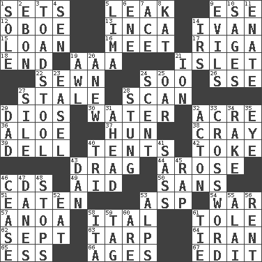 ACROSS 1. Arranges properly for use 5. Path through which fluid escapes 9. Compass dir. 12. Mitch Miller's instrument 13. South American Indian 14. _ the terrible 15. Grant temporary use of 16. Confront 17. Port city in Latvia 18. Conclude 19. Auto club (abbr.) 21. Small island 22. Stitched 24. "Barney Miller" actor Jack 26. Compass dir. 27. Lacking originality or spontaneity 28. Examine minutely or intensely 29. "Vaya con ____" 30. Wetness 32. Measure of real estate 36. _ vera 37. Attila the _ 38. Supercomputer manufacturer 39. Small valley 40. Portable shelters 42. Casino tip 43. To trail on the ground 44. Came up 46. Music discs 49. Help 50. Without 51. Consumed 53. Cleo's killer 54. Armed conflict 57. Small Philippine buffalo 58. Slanted text style (abbr.) 61. Lacquered or enameled metalware 62. Back-to-school mo. 63. Canvas cover 64. SW Asia republic 65. Curvy letter 66. Matures 67. Prepare for publication DOWN 1. Not divided or shared with others 2. Inky black, to poets 3. Inedible or poisonous agaric 4. Elected rep. 5. Pale green bean 6. Compass dir. 7. Adept person 8. Krazy ___ of comics 9. Vices 10. Gurus 11. Maternal 14. Big collection agency 19. Leather borer 20. Afresh 21. Electrically charged atom 23. Artist's stand 24. Aroma 25. Boat paddle 27. Drop; flow; fall 28. Feeling sharp psychological pain 29. June honoree 31. Having the leading position 32. Gambison 33. What you're doing now 34. Libertine 35. Sight organ 40. Three (prefix) 41. Backtalk 43. One of the 12 tribes of Israel 45. Reproach for some lapse or misdeed 46. Stop 47. Natives or inhabitants of Denmark 48. Discontinues 52. Erode 53. High mountains 55. Jai _ 56. Monthly bill 58. Call ___ day 59. Label 60. "We ___ not amused" (Victoria) 61. Standoff