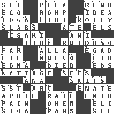 ACROSS 1. Put into a specified state 4. Entreaty 8. Tear apart 12. Environmental prefix 13. Play 14. The content of cognition 15. Ancient Roman robe 17. Needle case 18. Agitated, as a liquid 19. Thick slices 21. Had dinner 23. Raised railways 24. 1973 Nobel Price Winner (Physics) Leo 26. Cuckoo 28. Hoop that covers a wheel 30. Boisterous (Brazilian Portuguese) 34. At a great distance 37. Silent film actress Nazimova 39. Mild oath 40. Falsehood 41. New (sp.) 43. Flaplike covering 44. Pulitzer Prize-winning author Ferber 46. Passed on 47. Begley and Asner 48. Electrical Measurement 51. Observes 54. Santa ___, CA 55. Burlesque acts 58. Fast jet (abbr.) 61. Curve 63. Related on the mother's side 65. Showery time 67. Pace 71. Arab leader 72. Ache 73. Presage 74. Connecticut Ivy Leaguer 75. Portico 76. Zero-star reviews 77. Perceive with the eye DOWN 1. Puts into a specified state 2. Learning spot: Fr. 3. Ancient Roman robes 4. Before (prefix) 5. Car dealer's back yard 6. Australian flightless bird 7. Capital of Western Samoa 8. River (Sp.) 9. Singer Brickell 10. 1994 drama film starring Jodie Foster 11. 24-hour periods 16. Blind as ____ 18. Painter Guido (1575-1642) 20. What Jean-Claude Killy likes to do 22. The 19th letter of the Greek alphabet 25. SW Asia republic 27. Binary compound 29. Evade 30. All-night dance parties 31. Stare at amorously 32. Alleged 33. Probability 34. Soared 35. Opera by Verdi 36. Monthly bill 38. Luau accessory 42. Lyric poems 45. _ moment's notice (2 wds.) 49. Of or related to the anus 50. Slender fish 52. Make supply last 53. Trig term 56. Softens 57. Vertical member of a panel or frame 58. Plant excrements 59. Petty quarrel 60. Musical group of three 62. Riding implement 64. One of the Great Lakes 66. _ tizzy (2 wds.) 68. Nursemaid (var.) 69. Nine, plus one 70. Followers of ems
