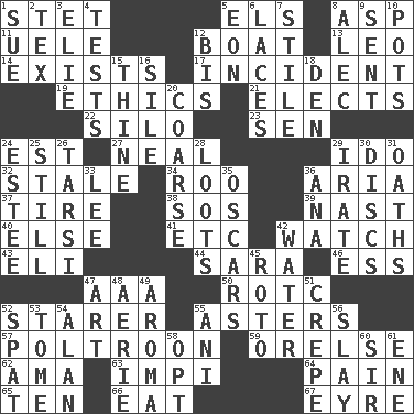 ACROSS 1. Proofreading order 5. Raised railways 8. Cleo's killer 11. Ubangi River tributary 12. Water vessel 13. Lion 14. Is 17. Happening 19. Principles of right and wrong 21. Chooses 22. Grain storage tower 23. Elected rep. 24. Eastern Standard Time (abbr.) 27. Be tempered by heat 29. Wedding promise 32. Having lost freshness 34. Friend of Pooh 36. Roberta Peters solo 37. Hoop that covers a wheel 38. Mayday 39. Political cartoonist Thomas 40. Otherwise 41. And so on (abbr.) 42. Observe 43. Biblical high priest 44. "Two Mules for Sister ____" 46. Double-curved letter 47. American Automobile Association (abbr.) 50. College mil. group 52. A viewer who gazes fixedly 55. Michaelmas daisies 57. Characterized by complete cowardliness 59. Threatening words 62. Nanny (var.) 63. Body of Kaffir warriors 64. Ache 65. Nine, plus one 66. Erode 67. Jane of fiction DOWN 1. Institute legal proceedings 2. John Ritter's dad 3. Writer Wiesel 4. Trials 5. Age 6. Shoestrings 7. Vertical member of a panel or frame 8. Actor Baldwin 9. Transmitted 10. Cooking vessels 12. Altar cloth linen 15. One or ones belonging to thee 16. Filth; sediment 18. Lair 20. Rough 24. First name in cosmetics 25. Free from disturbance or agitation 26. Tarsus (plural) 28. Plunders 29. Feeling or showing extreme anger 30. Flat circles 31. Curses 33. Area sheltered from the wind 35. Motion picture awards 36. Santa ___, CA 42. Wetness 45. Printing process, for short 47. Tate display 48. Nest on high 49. Odor 51. Streamer paper 52. Petty quarrel 53. Heavy book 54. ____ Jay Lerner 55. Cuckoo 56. Kill 58. Choose 60. Title for a knight 61. Compass dir.