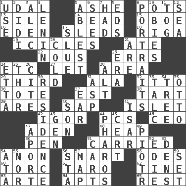 ACROSS 1. Freehold land 5. American tennis player Robert 9. Plant holders 13. Filth; sediment 14. Necklace unit 15. Mitch Miller's instrument 16. Genesis locale 17. Bobsleighs 18. Port city in Latvia 19. Winter's stalactites 21. Had dinner 22. Good sense 23. Blunders 24. And so on (abbr.) 27. Allow 28. Type of rug 29. One of three equal parts 31. Wing 32. "Tell ____ the Marines!" 36. Carry 37. Eastern Standard Time (abbr.) 38. Small pie 39. Ancient Greek god of war 40. Plant excrement 41. Small island 42. Composer Stravinsky 44. Personal Computers (abbr.) 46. Corporate head (abbr.) 47. An important port of Yemen 48. Pile 50. Animal enclosure 51. Borne 54. At once, immediately (arch.) 56. Don Adams' spy role 58. Lyric poems 60. Torque (variant) 61. Pacific island yam 62. Prong on a fork 63. Johnson of "Laugh-In" 64. Flats, for short 65. State of inaction DOWN 1. Purpose 2. "You Light Up My Life" star Conn 3. Actor Baldwin 4. Soviet premier 1918-24 5. Most capable 6. Observes 7. Possessed 8. Begley and Asner 9. Likenesses of persons 10. Off-Broadway awards 11. Coat; cloak 12. Ocean 17. Turn sharply 20. Having a low temperature 21. "We ___ not amused" (Victoria) 23. Period 24. Singer James 25. Son of Odin 26. Quote 28. Keyboard modifier key 30. Dwelling 31. Cleo's killer 33. Baby powder 34. Family _ (genealogy) 35. Von Bismarck 37. Hearing organ 40. Male offspring 41. Austrian river, tributary to the Danube 43. Commissioned military rank (abbr.) 44. N Egypt peninsula 45. Foregone conclusion 47. To the left, to Queeg 49. Peter (Polish) 51. Draw slowly or heavily 52. Singer Brickell 53. Lairs 54. _ moment's notice (2 wds.) 55. Not either 56. R.R. building 57. Atlas unit 59. Arrange properly for use