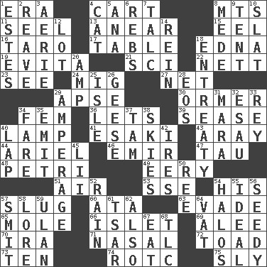 ACROSS 1. Period 4. Haul 8. Mountains (abbr.) 11. Stitch closed the eyes of (a falcon) 13. Approach 15. Snakelike fish 16. Pacific island yam 17. Eating place 18. Pulitzer Prize-winning author Ferber 19. Webber/Rice musical 21. _-fi 22. Remaining after all deductions 23. Perceive with the eye 24. Russian fighter aircraft 27. Fish or hair follower 29. Domed church section 30. Abalone 34. Opposite of masc. 36. Allows 39. Gospel singer Marvin 40. Desk light 41. 1973 Nobel Price Winner (Physics) Leo 43. Like ___ of sunshine 44. Satellite of Uranus 46. Arab leader 47. The 19th letter of the Greek alphabet 48. _ dish (used to culture cells) 49. Suggestive of the supernatural 51. Wind 53. Compass dir. 54. Part of HMS, perhaps 57. Strike heavily 60. _ moment's notice (2 wds.) 63. Dodge 65. Undercover agent 66. Small island 69. Toward shelter 70. Lyricist Gershwin 71. Rhinal 72. Frog relative 73. "___ Little Indians" 74. College mil. group 75. Roguish DOWN 1. _____ Park, CO 2. Rob, plunder, or pillage 3. Nest on high 4. Feline 5. Santa ___, CA 6. Confederate soldiers (slang) 7. Baby powder 8. Ancient Persian 9. Portable shelter 10. Narrow board 12. Car dealer's back yard 14. It's straight from the horse's mouth 18. Plea 20. Electrical Unit 25. Capri or Wight 26. Honkers 28. Greek goddess of the dawn 29. Electrical Measurement 31. Hindu Mythology: god of death 32. He sold his birthright 33. Marina Del _, California 34. Conductor's collection 35. Give off 37. Scottish cap 38. Atmospheres 40. Pet locale 42. Angers 45. Cards in a Roman deck? 50. To sift 52. Water falling in drops from the sky 54. Radiant circles of light 55. Standard of perfection 56. Morally degraded 57. Stricken, poetically 58. Old wives' tales, e.g. 59. Uhlan (variant) 61. Russian ruler of old 62. In addition 64. Large container 67. Ingest 68. Affectionate concern, for short