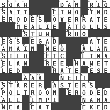ACROSS 1. Fly high 5. Daniel's nick name 8. River (Sp.) 11. Suttee (variant) 12. Fine (Spanish) 13. Working for oneself (abbr.) 14. Eats (away) 17. Make much ado about nothing 19. Ear of corn 21. Ringlike coral islands and reefs 22. Surprise greatly 23. 17th letter of the Greek alphabet 24. Double-curved letter 27. Mild oath 29. Had dinner 32. With great haste 34. Modern: prefix 36. ____ Jay Lerner 37. Grain storage tower 38. And so on (abbr.) 39. Pale green bean 40. Enthusiasm 41. Portuguese money of account (variant) 42. French painter Edouard 43. Directed 44. Pace 46. Compass dir. 47. Auto club (abbr.) 50. Remaining after all deductions 52. A viewer who gazes fixedly 55. Michaelmas daisies 57. Coward 59. Worn away 62. Everything 63. Body of Kaffir warriors 64. Nanny 65. Teachers' org. 66. Erode 67. Made supply last DOWN 1. Compass dir. 2. Boat paddle 3. Tiny particle 4. Amusement-park features 5. HTML Container Element 6. Approach 7. Compass direction 8. Monetary unit of Yemen 9. International (abbr.) 10. Lyric poems 12. Enemy 15. Eroded 16. Strike heavily 18. Friend of Pooh 20. More lacking in sense or substance 24. Artist's stand 25. Grin 26. First course 28. Prevent from occurring 29. Place in a line 30. Corrects by punishment or discipline 31. Maternal 33. Electrically charged atom 35. Seas 36. Wing 42. Distance measurement 45. False hair 47. Nonscientific branch of learning 48. Nest on high 49. Odor 51. Marketplace scale 52. Connect, as a bridge 53. Lacquered or enameled metalware 54. Silent film actress Nazimova 55. Cuckoo 56. Neighbor of Neb. 58. Choose 60. Compass dir. 61. June honoree