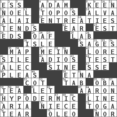 ACROSS 1. Curvy letter 4. First man 8. Peachy ____! 12. Christmas carol 14. Literary convention 16. Inventor's middle name 17. Mountain range southwest of Kyrgyzstan 18. Pleas 20. Looks after 22. Hearing organ 23. Eastern Standard Time (abbr.) 24. Begley and Asner 25. Clumsy lout 28. Experiment locale 30. Small island 31. Gurus 35. Atlas unit 37. Chow _ 40. Old wives' tales, e.g. 41. Filth; sediment 42. Goodbye (Sp.) 44. Trial 45. Actor Baldwin 46. Trig term 47. Compass dir. 48. Entreaties 50. Inactive volcano in Sicily 52. Small bed 54. Bar bill 55. Chief or king in Benin or Nigeria 58. Afternoon social gathering 61. Allow 63. Composer Copland 65. Subcutaneous 70. Actor's bit 71. Operatic vocal solo 72. Sibling's daughter 73. Ancient Roman robe 74. Pull into pieces 75. Margarine 76. And not DOWN 1. Related on the mother's side 2. Having a sole or soles 3. Actors Connery and Penn 4. Had dinner 5. Spanish title 6. Fitting 7. Greater amount 8. Krazy ___ of comics 9. Writer Wiesel 10. Nights before holidays 11. Political cartoonist Thomas 13. Flaplike covering 15. Lick closed 19. Caspian sea tributary 21. Distress signal 26. _ mater 27. Eats 29. Greek mezzo-soprano Agnes 30. Medicinal drug used to evoke vomiting 32. Leaves 33. Celtic language 34. Put into a specified state 35. Place where flour is made 36. Toward shelter 38. One more than two 39. Music written for nine 41. Plant excrement 43. Stalk of a moss capsule 49. Disposed of to a purchaser 51. Basketball assoc. 53. Adolescent 55. Constellation of myth 56. Beat drum 57. Approach 58. Not this but _ 59. Jane of fiction 60. Capital of Western Samoa 62. Musical group of three 64. Keyboard modifier key 66. Boat paddle 67. Cartoonist voice _ Blanc 68. Frozen water 69. Corporate head (abbr.)