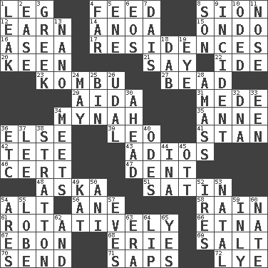 ACROSS 1. Part of a journey 4. Nourish 8. The Jewish people; Israel 12. Merit 14. Small Philippine buffalo 15. Southwest Nigerian state 16. At sea 17. Dwellings 20. Peachy ____! 21. Declare 22. Binary compound 23. Dried seaweed eaten as food 27. Necklace unit 29. Opera by Verdi 31. Ancient Persian 34. Non-adult bird? 35. Queen of England 1702-14 36. Otherwise 39. Lion 41. Comedian Laurel of Laurel & Hardy 42. Wig 43. Goodbye (Sp.) 46. Certainty 47. Incision 48. "____ silly question..." 51. Smooth fabric 54. Keyboard modifier key 56. A saturated hydrocarbon 58. Water falling in drops from the sky 61. Producing rotation 66. Inactive volcano in Sicily 67. Inky black, to poets 68. One of the Great Lakes 69. Table seasoning 70. Transmit 71. Plant excrements 72. Potassium hydroxide DOWN 1. Path through which fluid escapes 2. Relaxation 3. Hellenic 4. Distant 5. Compass dir. 6. Greek goddess of the dawn 7. Raised platform 8. Male offspring 9. Event 10. Wrote a lyric poem 11. Olfactory organ 13. Billionth: prefix 18. Small moist lump or mass 19. Sight organ 24. Fifth month 25. Storage container 26. Allodial 28. Collect or gather 30. At or in the front 32. Heredity factor (abbr.) 33. Car or cant ending 34. Confronts 36. And so on (abbr.) 37. Area sheltered from the wind 38. Ski resort town in Vermont 40. Lyric poems 44. _ tizzy (2 wds.) 45. Baseball player Mel 49. Krazy ___ of comics 50. Black tropical American cuckoo 52. Angers 53. Relating to or accompanying birth 54. Ancient Greek god of war 55. Ear part 57. Nights before holidays 59. In an inward manner 60. Nathan's nickname 62. Also 63. Epoch 64. Mouth edge 65. It is so